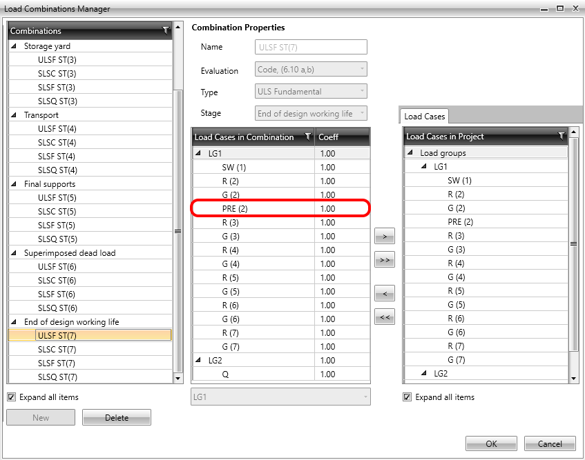 In combinations of the global model, the coefficients of load cases containing prestress should be equal to 1.0. The coefficients rsup and rinf will be applied as described above.