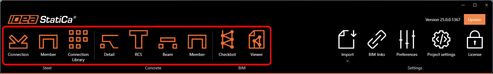 All IDEA StatiCa tools are listed in the top ribbon simply categorized under Steel, Concrete, and BIM groups, with new application icons.