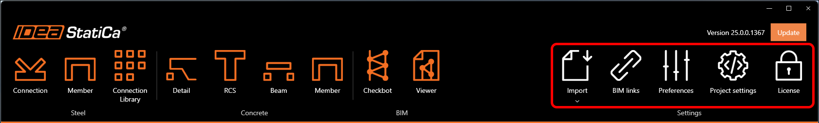 IDEA StatiCa software settings are placed in the right part of the main ribbon.
