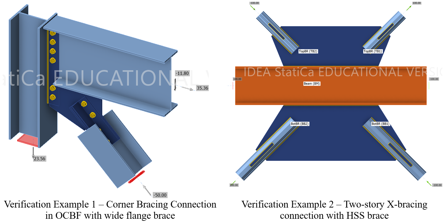 For the presented study, two connections – a corner connection and two-story X-bracing connection, which are common in an ordinary concentrically braced frame (OCBF) system, are analyzed using CBFEM and verification with AISC is performed.