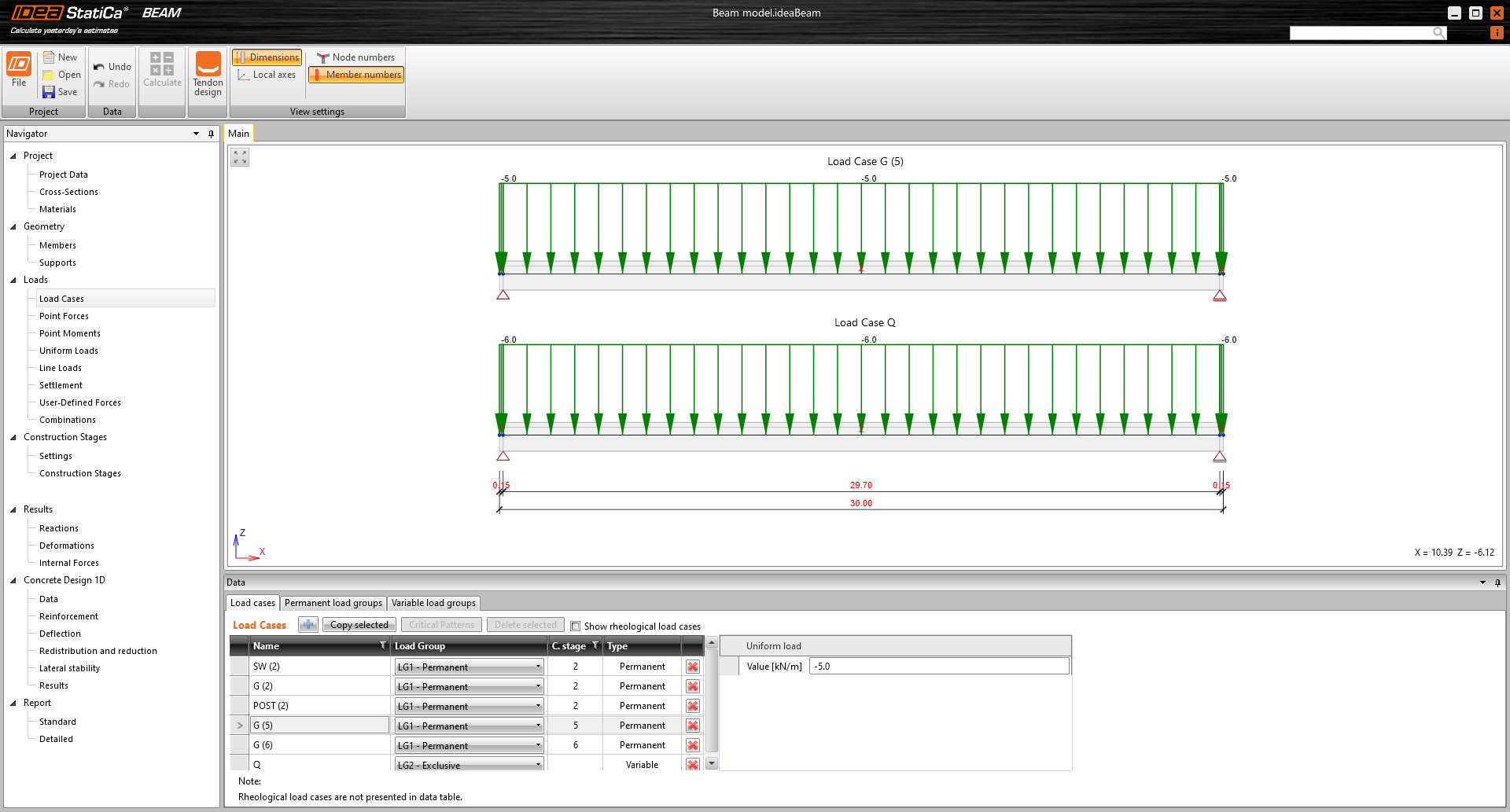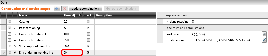 The time (age of the concrete) for this stage is 60 days. The purpose of this stage is to check the concrete beam at the start of its working life including permanent and variable loads. So the other two load cases are added. Load impulses are of course the same as in the Beam application model.