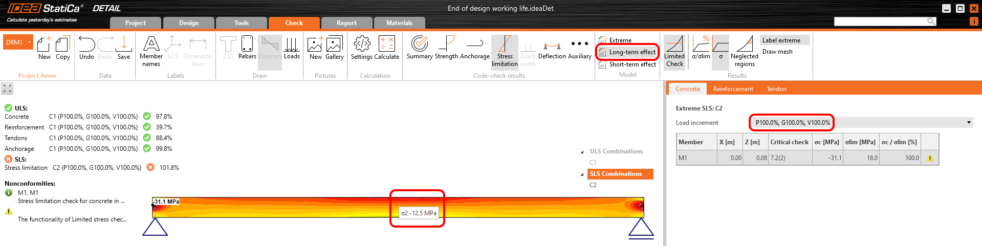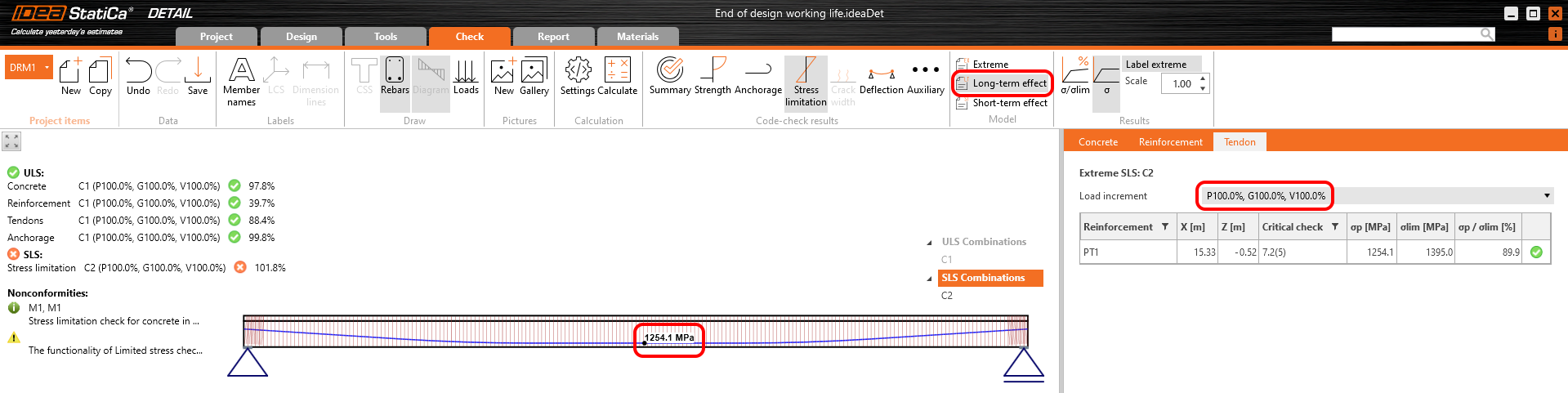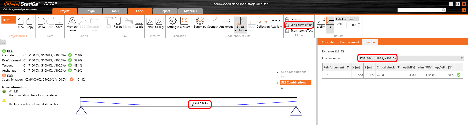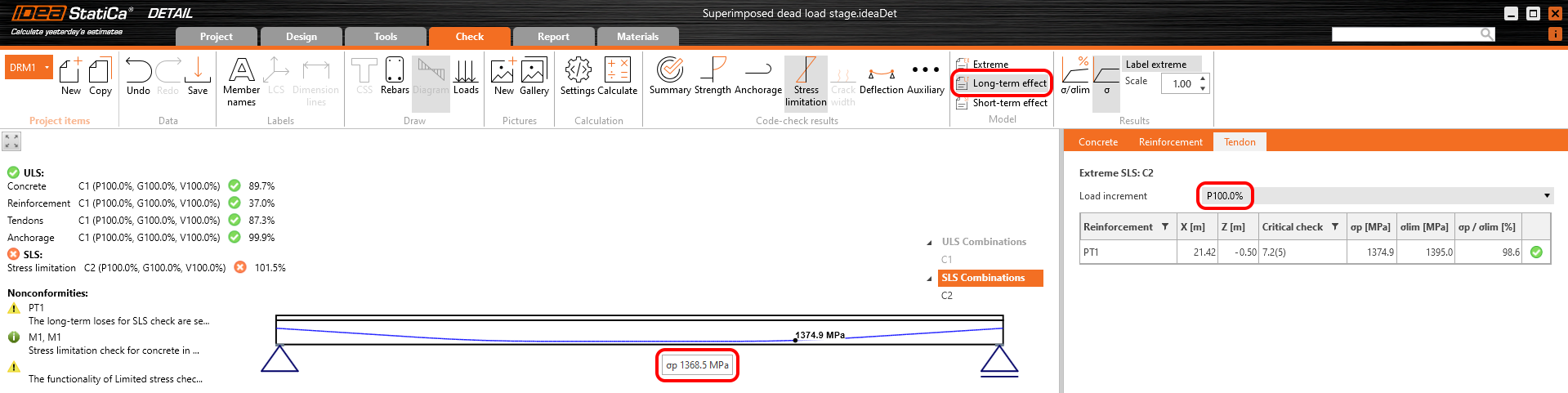 The long-term losses can be calculated as σ∞ / σpa = 1185 / 1368.6 = 0.865 -> long-term loss is 13.5%. The value of σ∞ is determined in The beam parameters chapter in the Tendon Stress/Losses chart. Let's input the value and compare the results.