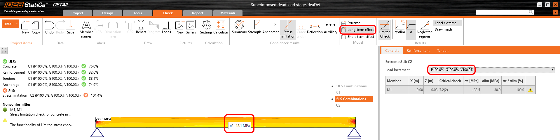 Both of them will be applied in the first load increment. Long-term losses for SLS checks are set to 0% and the values for the prestressing procedure are input the same as for the model in the Beam application. You can also compare automatically calculated stress after short-term losses σpa with the Tendon Stress/Losses chart from Beam.