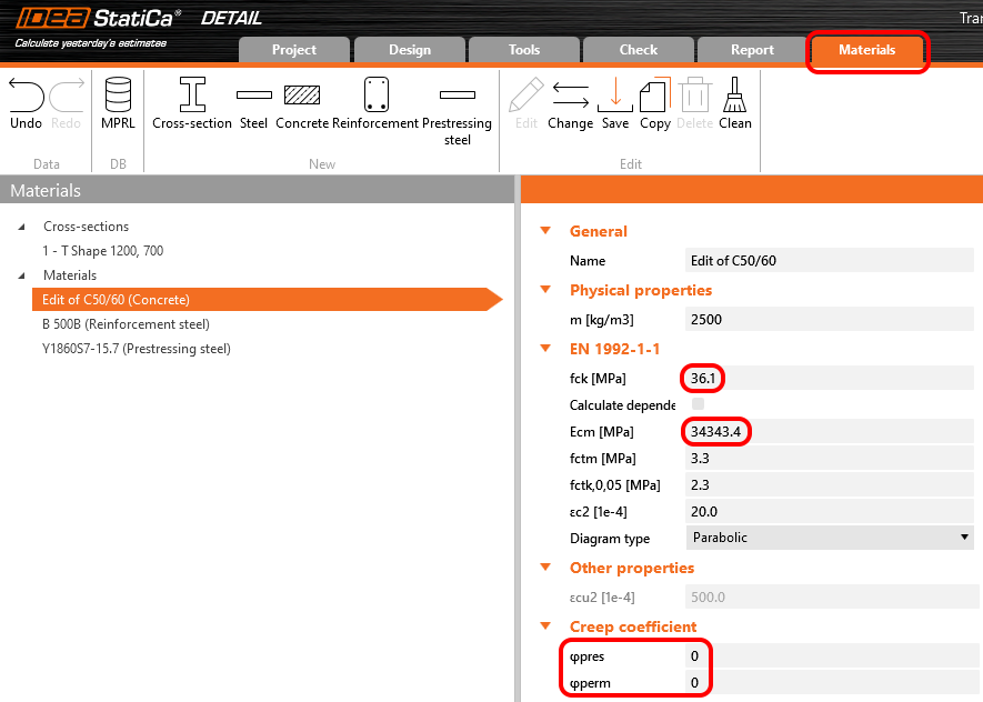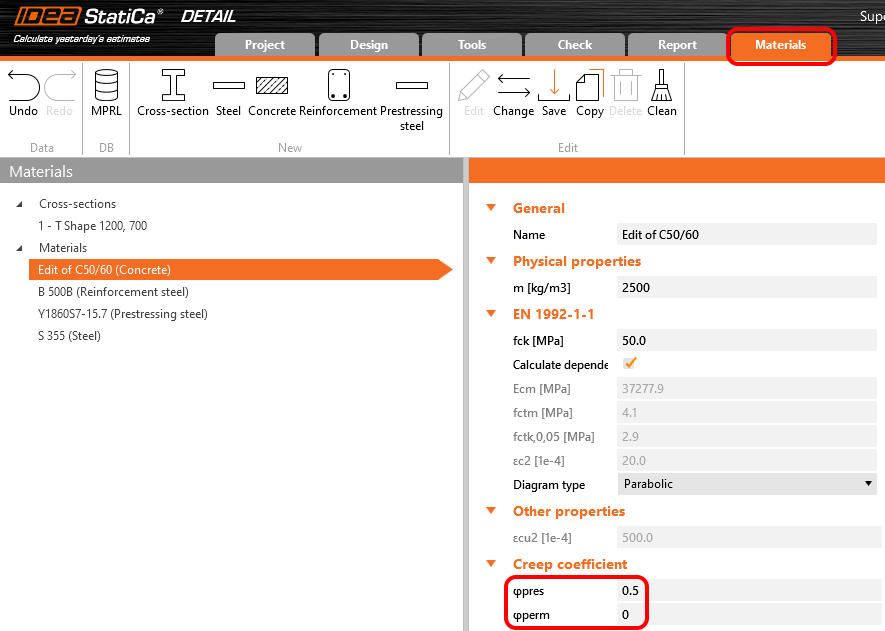 In Detail application, the creep coefficient can be set in Materials & models. It is obvious that the modulus of elasticity has to be set as the default Ecm value (recall the Increment chapter and the chart in it). You can also notice that the value of φperm = 0.0, which is because we want to apply permanent loads as short-time loads as well as variable loads.