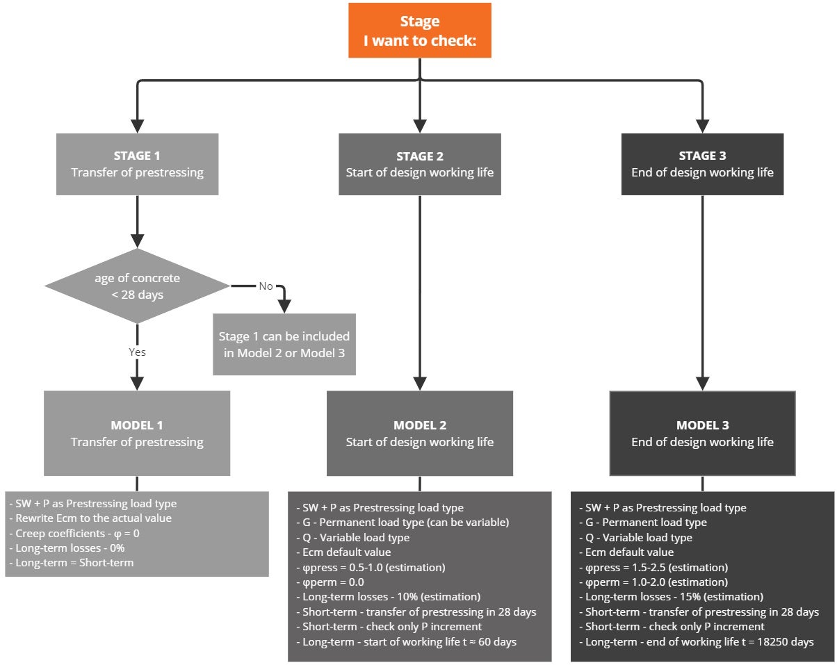 Note that in the attached Detail application models for Stage 2 and Stage 3 checks for short-term V increments are unsatisfactory. It follows from the preceding that for Model 2 and Model 3 for short-term effects, only the first increment P needs to be considered (since no other permanent loads, nor variable loads will be applied during applying prestressing). It is valid only if the age of concrete when applying prestressing is greater than 28 days, otherwise, you have to do a special model for Stage 1 (for short-term effects).
