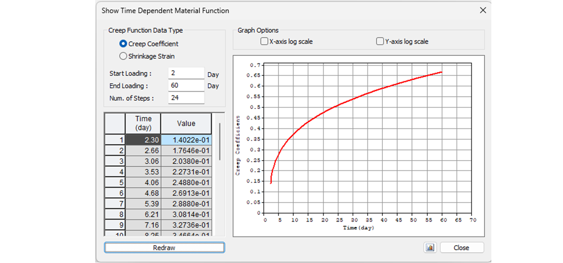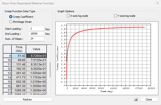 The approach will be the same as for the previous stage. First, we need to determine creep coefficients. In the following figure, you can see the creep coefficient function.
