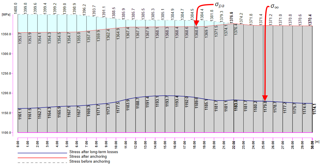 In the figure, we can see that σpa = 1368.6 MPa in the middle of the span.