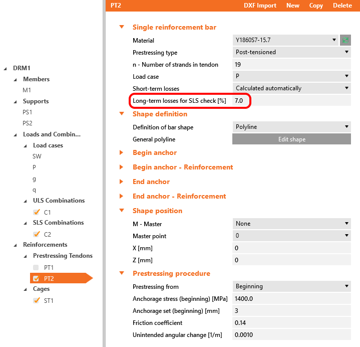 - Short-term losses are defined by the user - The input is the stress after anchoring (after short-term losses) σpa. You input the value of the stress in each vertex of the tendon.