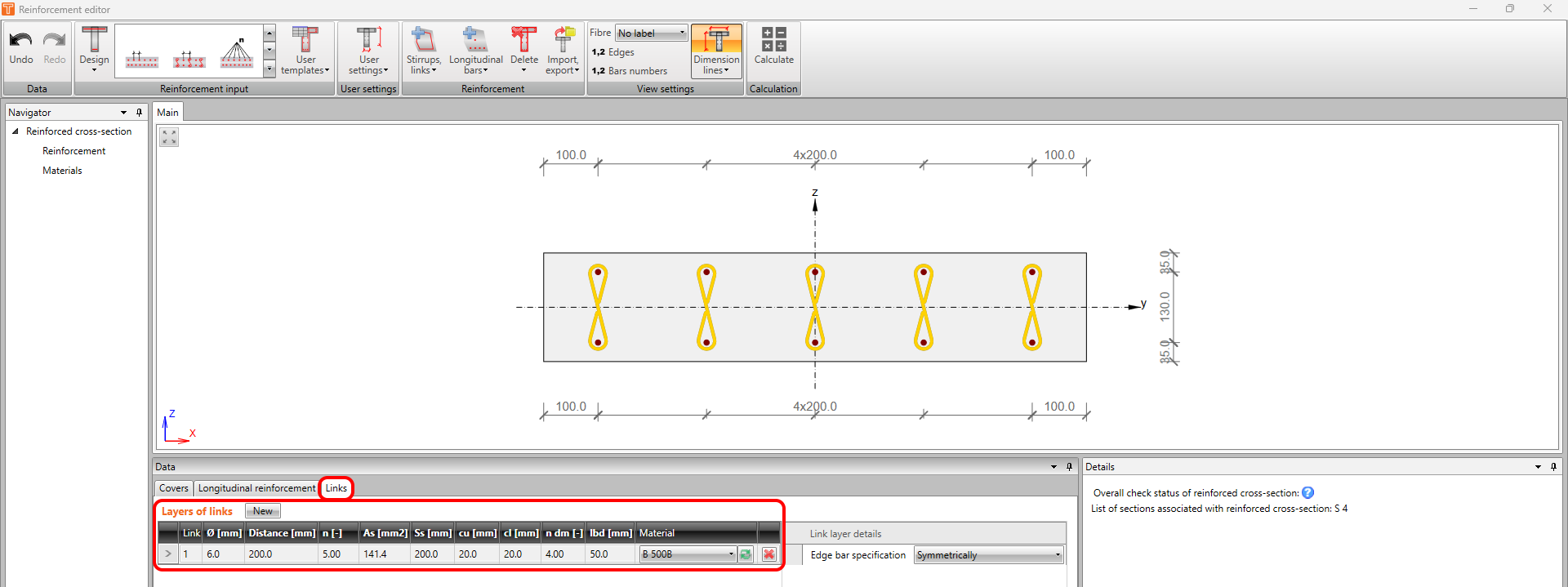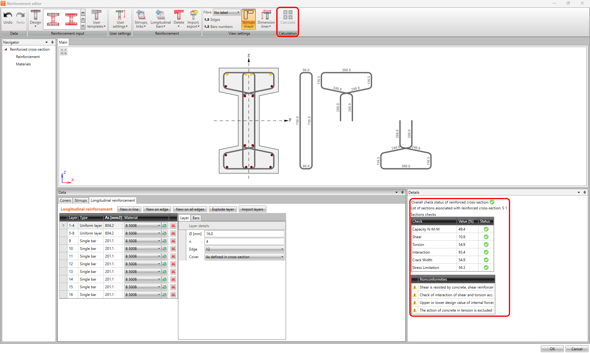 In the reinforcement editor, users usually iterate from version to version of the reinforcement design. A useful feature is to calculate the cross-section directly in the editor. There is the calculate button on the top ribbon. After calculation, you will see the overall check status of the reinforced cross-section. And also all of the relevant nonconformities will be available.
