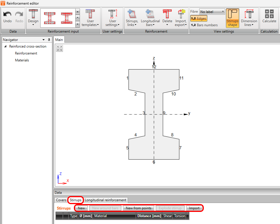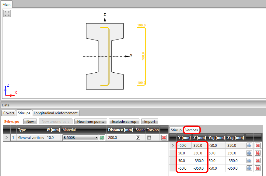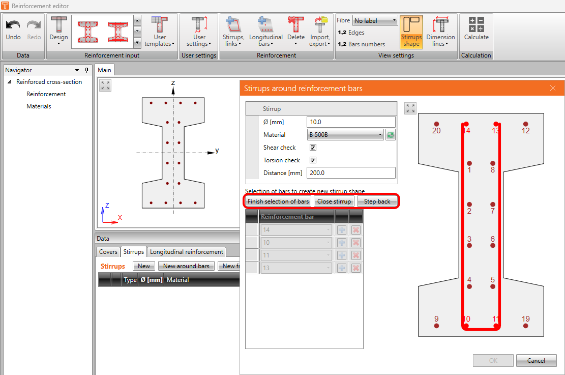 Click on the stirrup in the Main graphic window. The selected stirrup is highlighted, and you can see a table with properties in the Data window. Here you can set the diameter, material, spacing, and other settings depending on the stirrup type.
