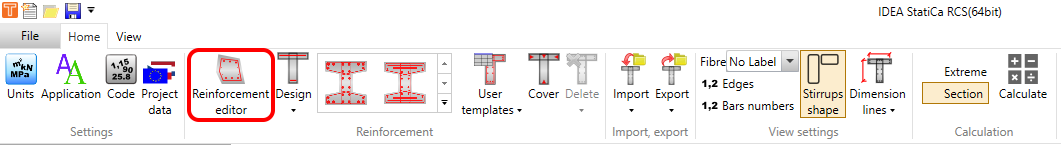 The Reinforcement editor can be very helpful. It is a tool providing you with many possibilities of how to reinforce a cross-section in the RCS application. To launch the editor, click on the Reinforcement editor button in the top ribbon.