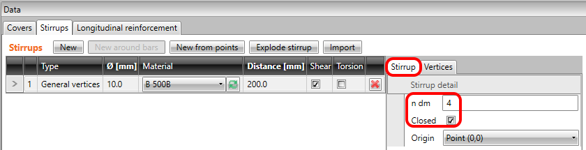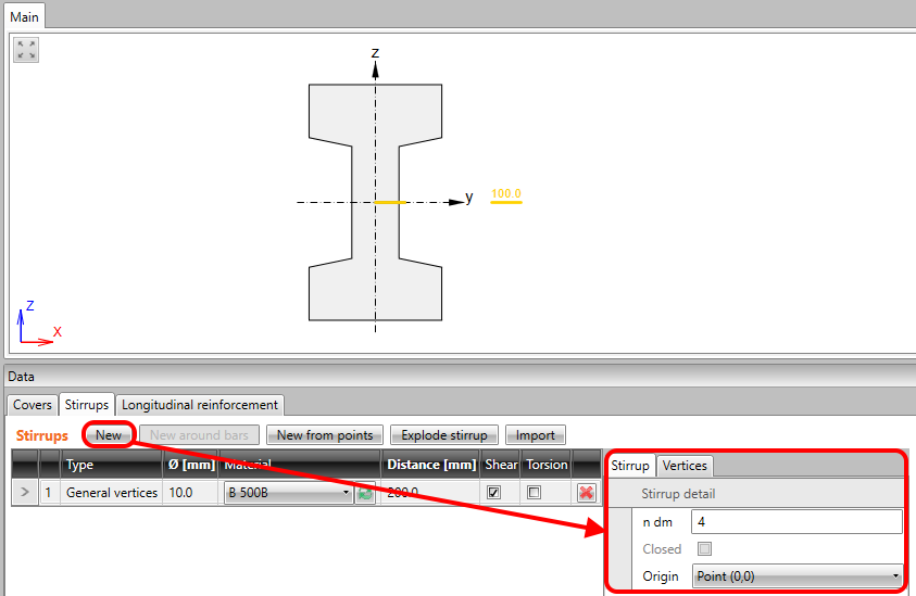 The New option defines stirrups based on coordinates. First, you need to define the origin as a Point (0,0) or as one of the vertexes in the Stirrup tab.