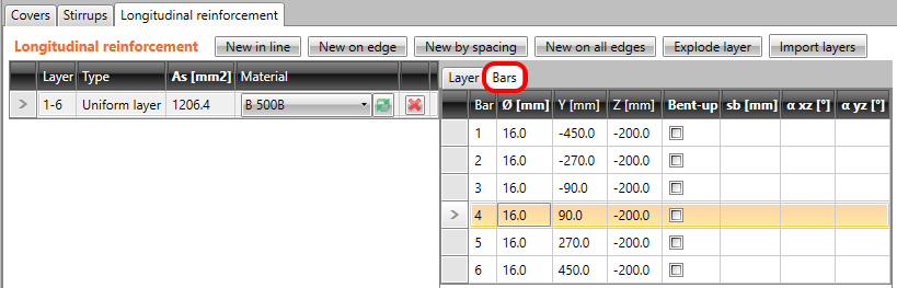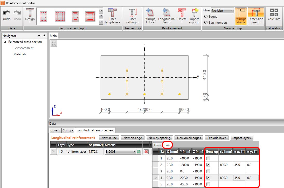 After that, you will see the tables of reinforcement bars and reinforcement layers in the Data window. Working with the tables, you can adjust properties such as the diameter, number of layers, if the reinforcement is bent-up, and reinforcement type (this functionality is meant for Fatigue calculation).