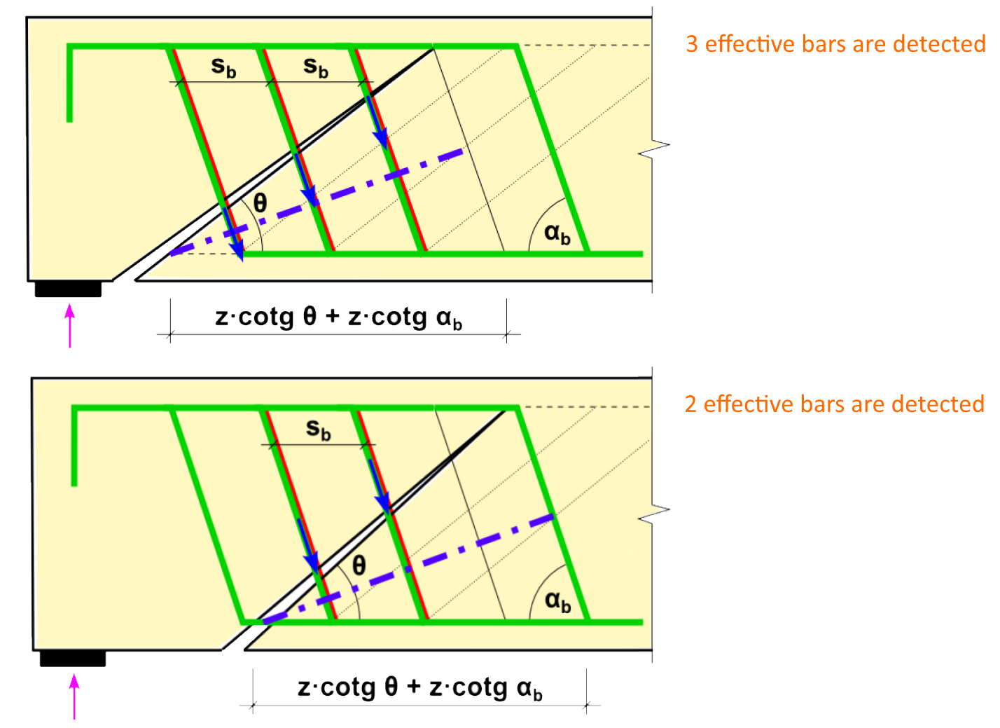 It is necessary to set the values of sb and α correctly. The distance sb is defined as a projection of the inclined part to the direction of beam axis (or a rather effective length of bent-up bar). For more layers of bent-up bars, the distance sb is defined as a horizontal distance between them. After this input, the automatic detection of effective bars in a projection of crack to the axis perpendicular to the geometry of bent-up bars is performed (blue dash-dotted line).