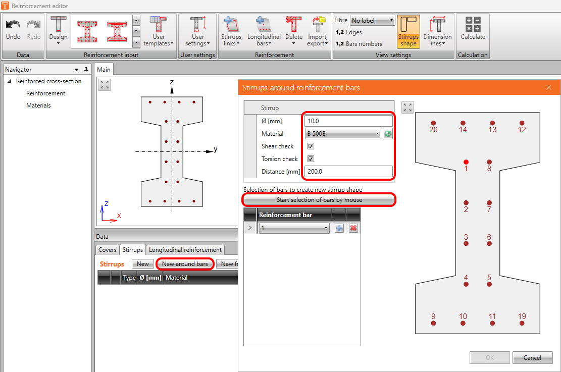 The New around bars option defines stirrups based on the reinforcement bars position. Click on the button, set the diameter and distance and click on Start selection of bars by mouse.