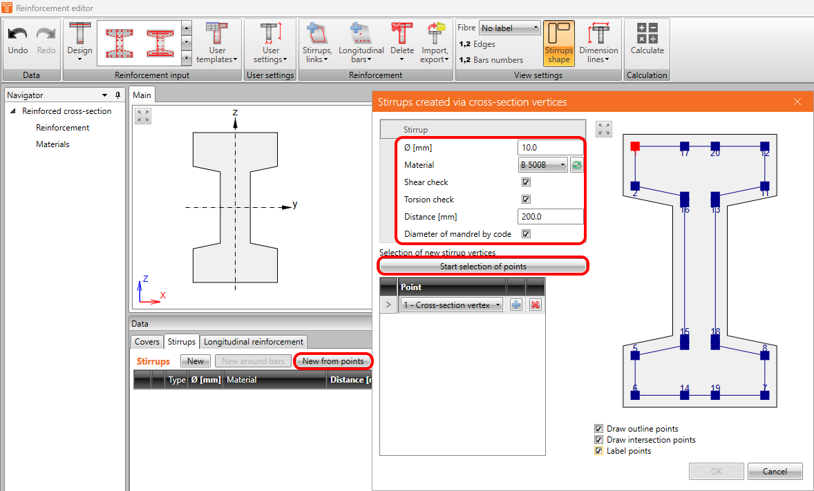 The New from points option defines stirrups based on the cross-section vertices. Click on the button, set the diameter and distance and click on Start selection of points.