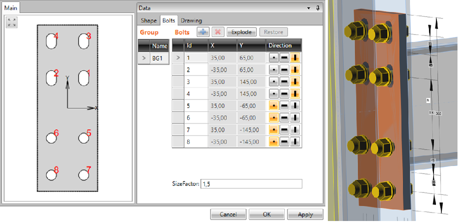 The option of slotted holes is newly placed in the editor of bolts. The direction and the size ratio can be set for each individual bolt.