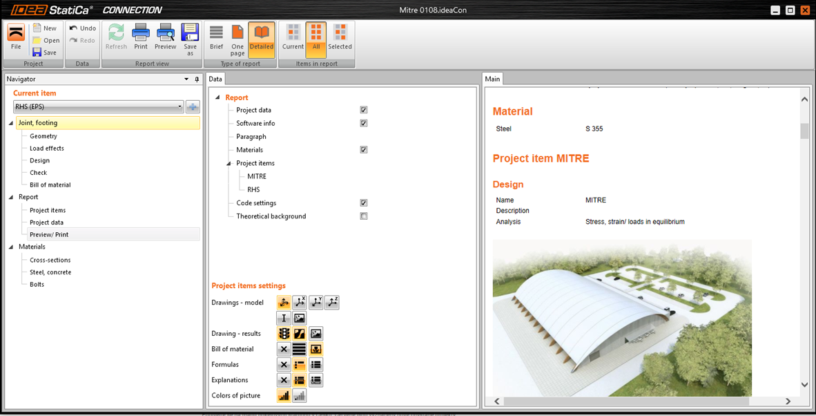 User-defined text and pictures can be included into the report of the project. You can also select, which project items will be included in the report.