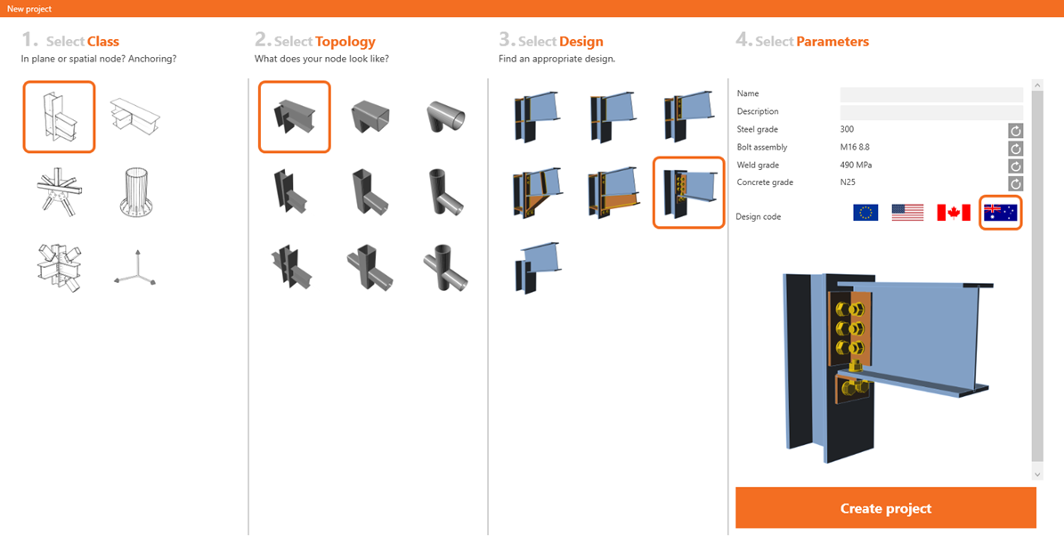 Australian code can now be selected in the Parameters table in the new connection wizard. All classes, topologies, and designs are available in the australian code (AU).