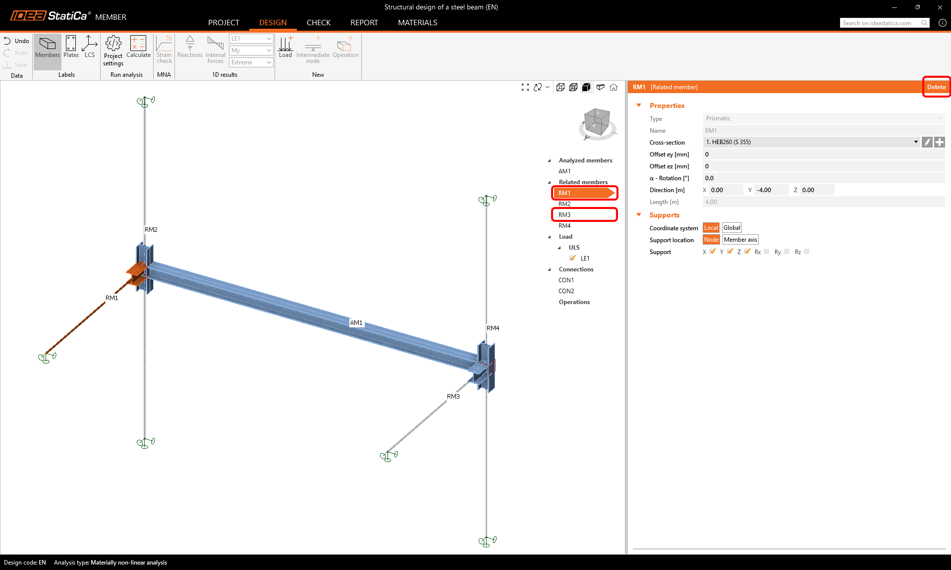Create a New project (left side bar) and type in the name. Use the beam geometry and use the design with the related members. Set the span to 8.0 m, select the cross-section HEB 260 for the beam, and click Create project.