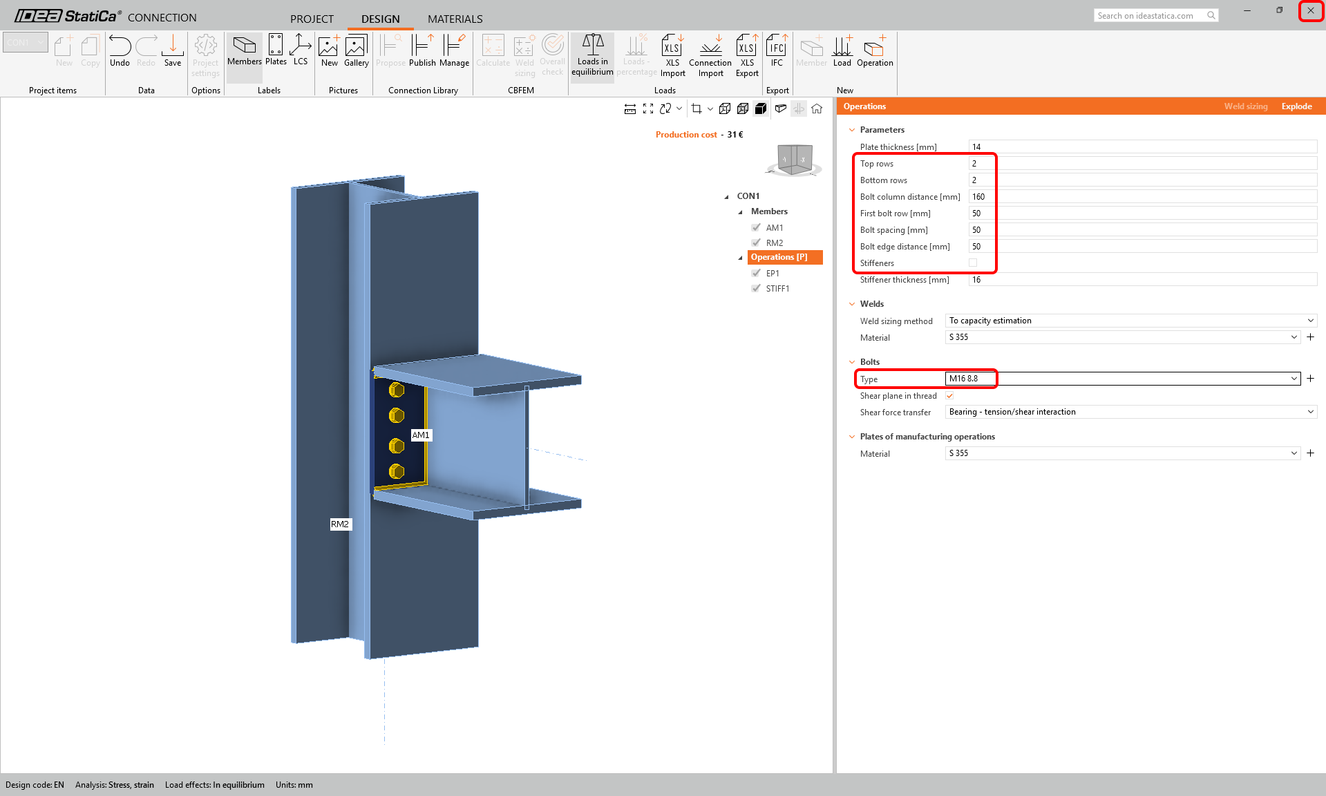 Change the parameters of the parametric template: 2 top rows, 2 bottom rows, bolt column distance 160 mm, first row, bolt spacing, and bolt edge distance - all 50 mm. The bolt type and size M16 8.8. And uncheck the stiffener option.