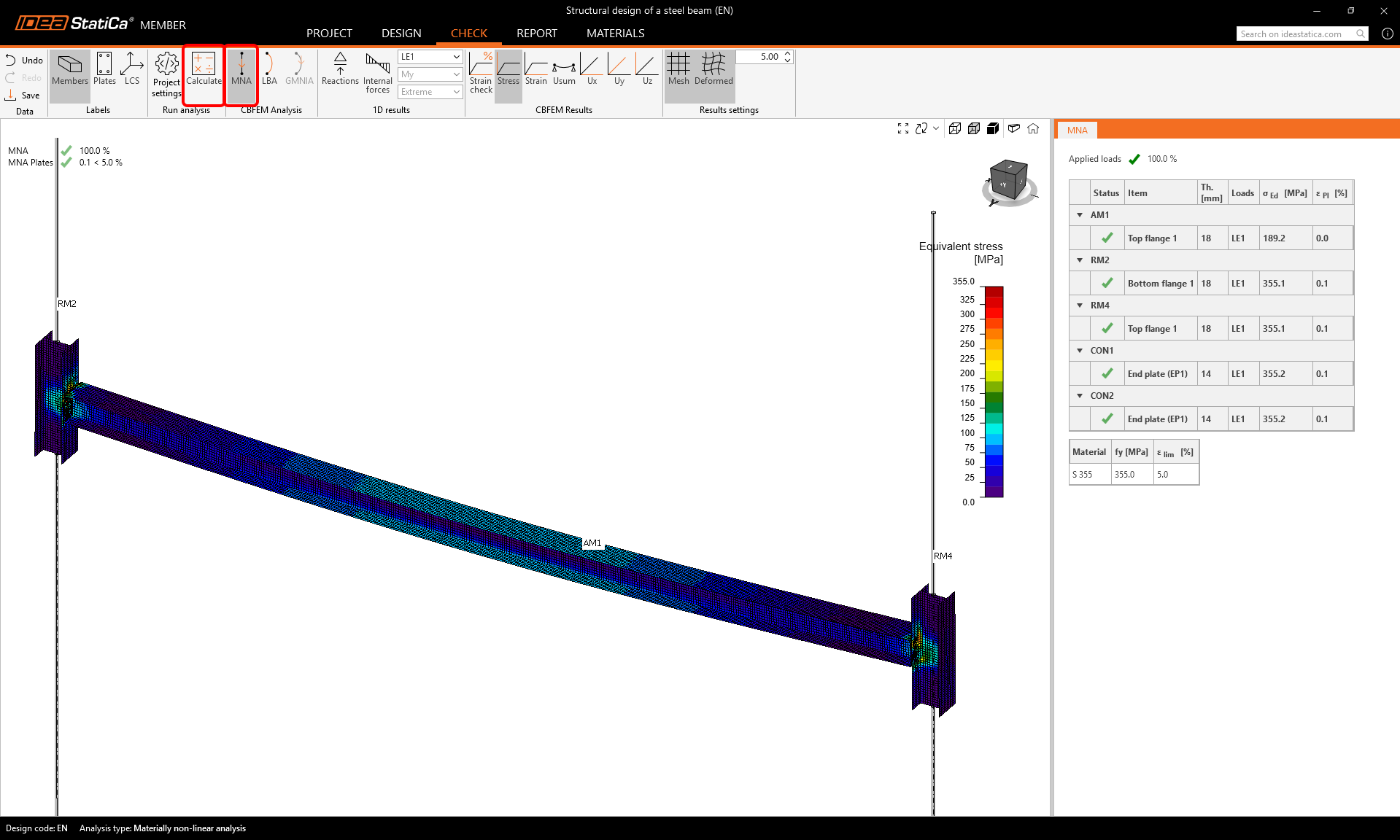 First, start the Materially non-linear analysis (MNA). Select the Tab Check, MNA, and click Calculate.