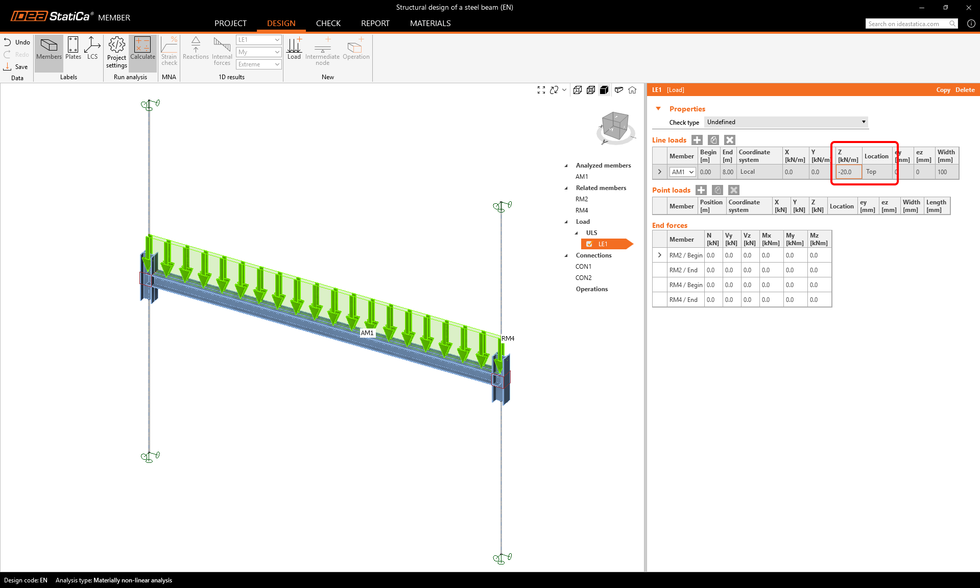Edit the value of the ULS/LE1 load to -20 kN/m in the z direction acting on the top flange.