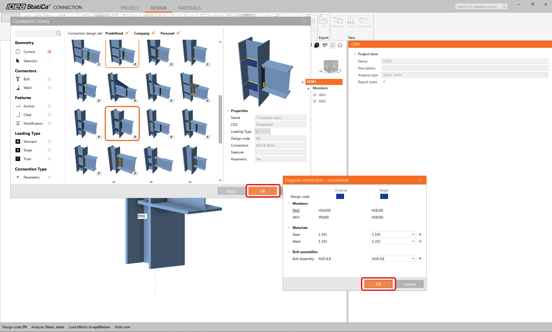 To design the second connection, select connection CON2 and click Apply to copy the offered design from connection CON1.