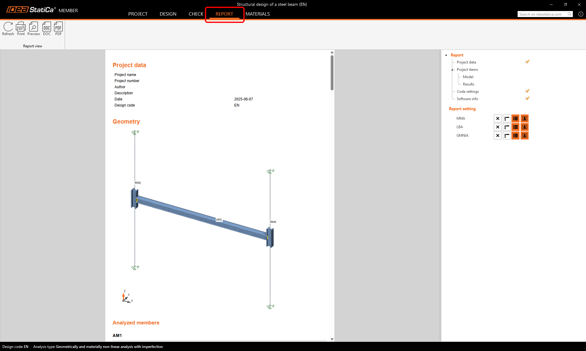 At last, go to the Report tab. IDEA StatiCa offers a customizable report to print out or save in an editable format.