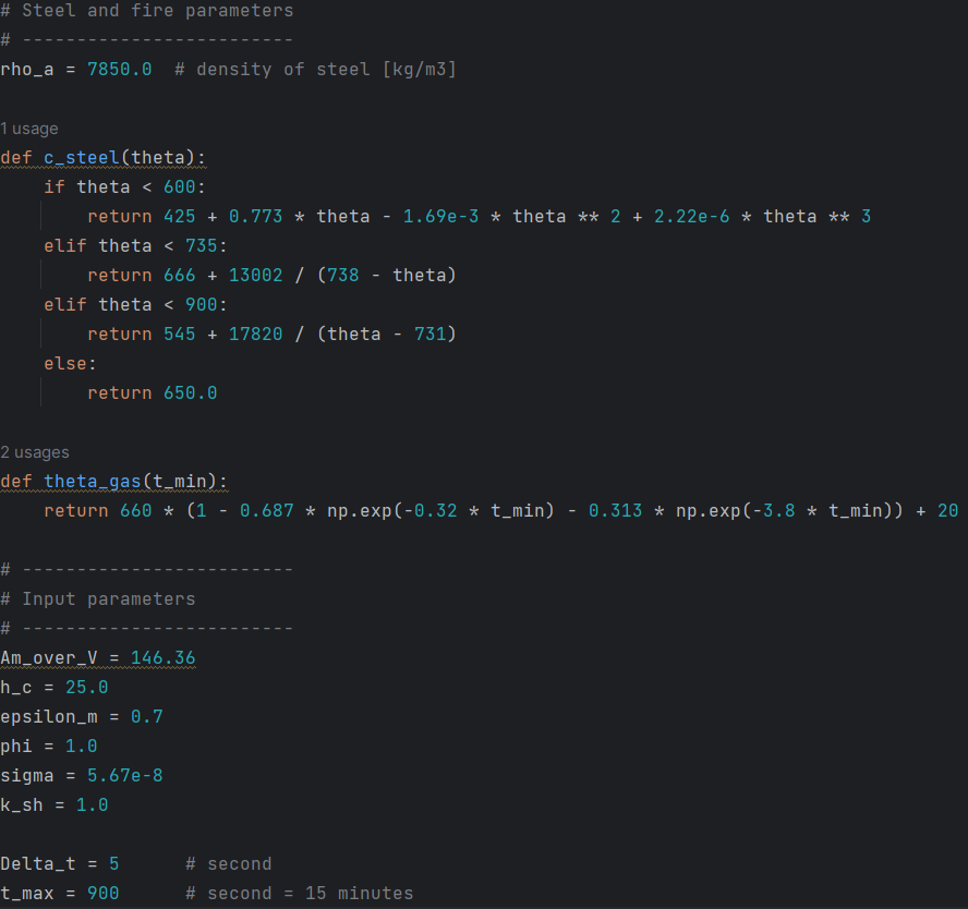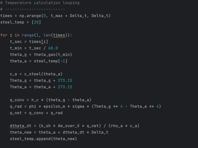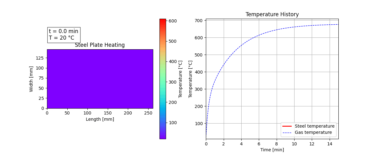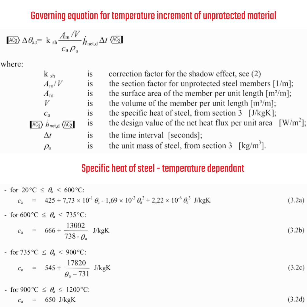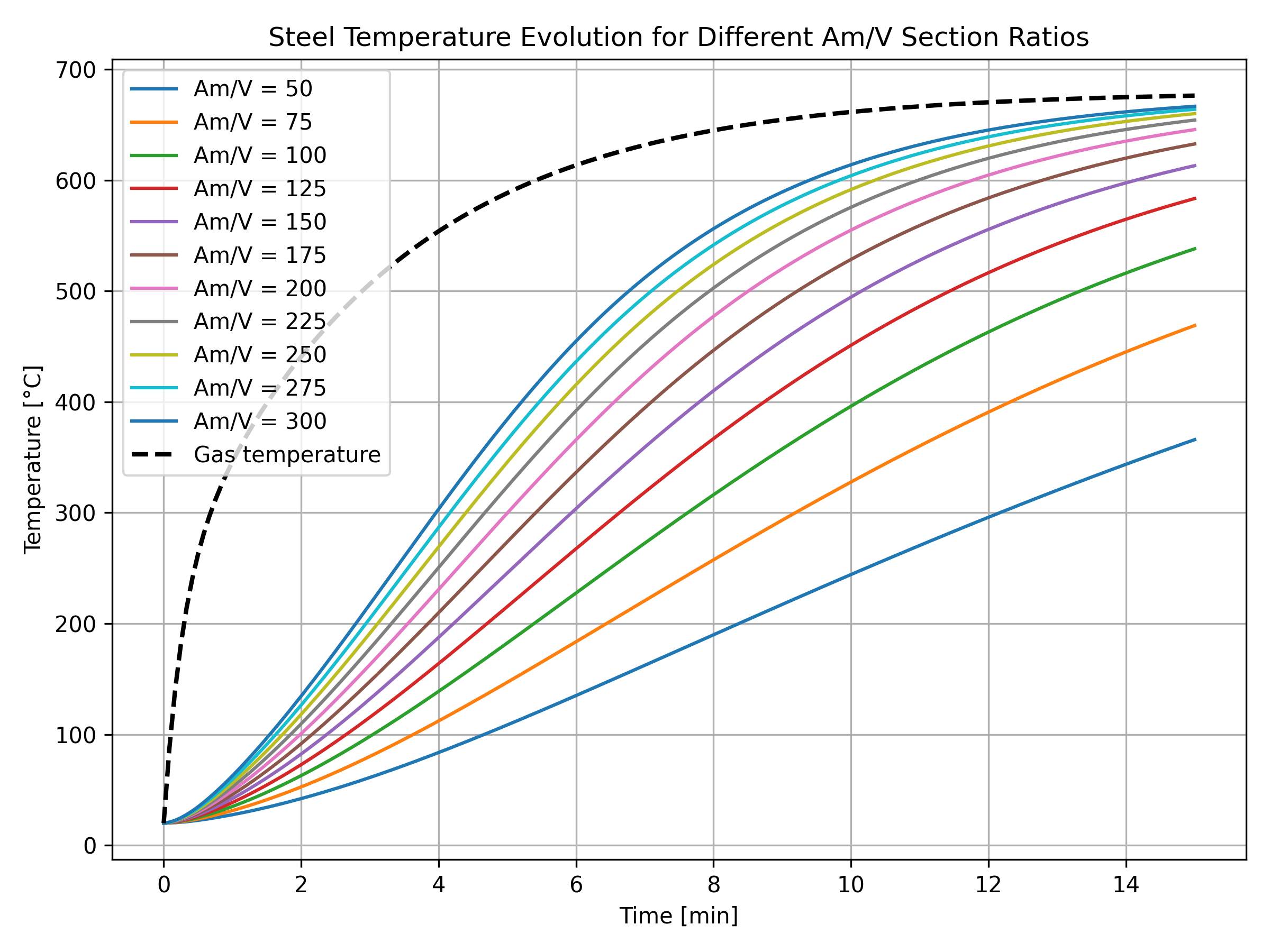 Las suposiciones se basan en EN 1993-1-2 para materiales de acero no protegidos. Debido a que no existe aislamiento protector, el material está directamente expuesto al calor por convección y radiación de las llamas, causando que se caliente mucho más rápidamente.