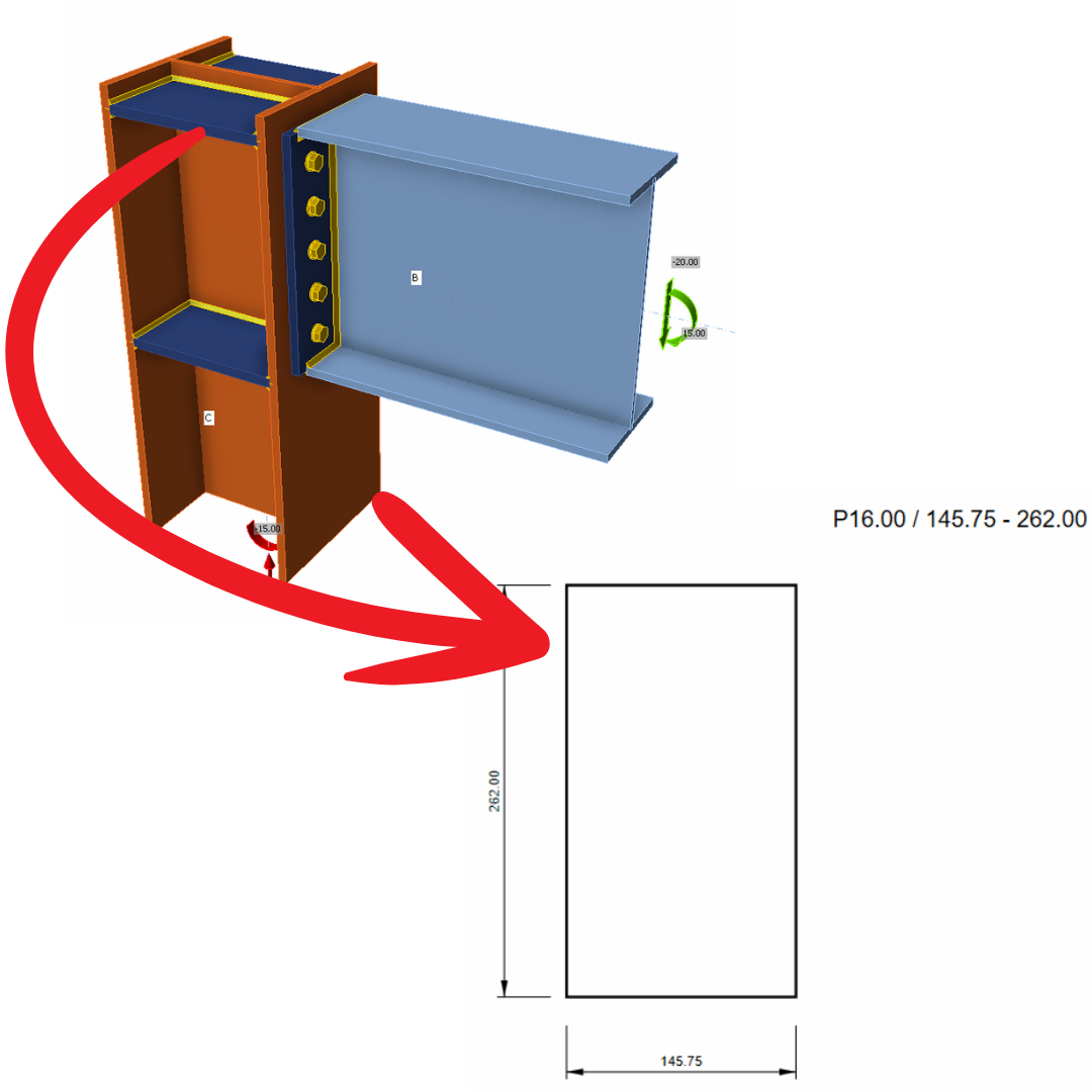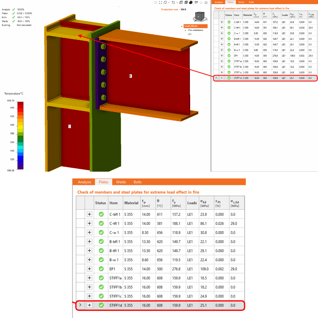 Los componentes de soldadura y pernos toman la temperatura de la placa conectada con la temperatura más alta. Más sobre suposiciones: https://www.ideastatica.com/support-center/general-theoretical-background#Fire-design