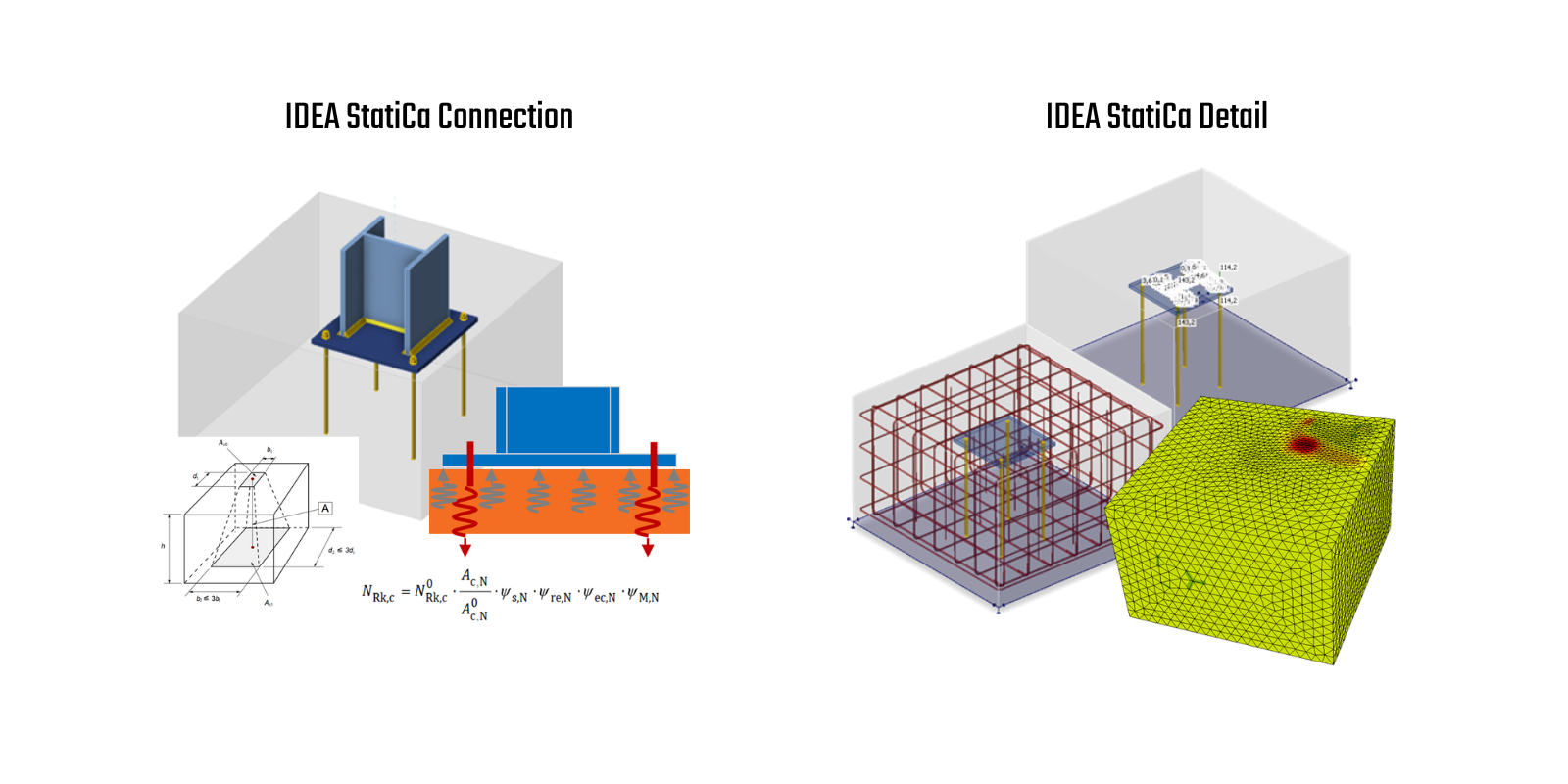 - IDEA StatiCa Connection – focused on assessing steel connections, including anchoring in concrete. The anchors are assessed according to empirical formulas in accordance with the standard. The concrete block is modeled using the "Winkler" scheme, so the possible assessment is for plain concrete only.