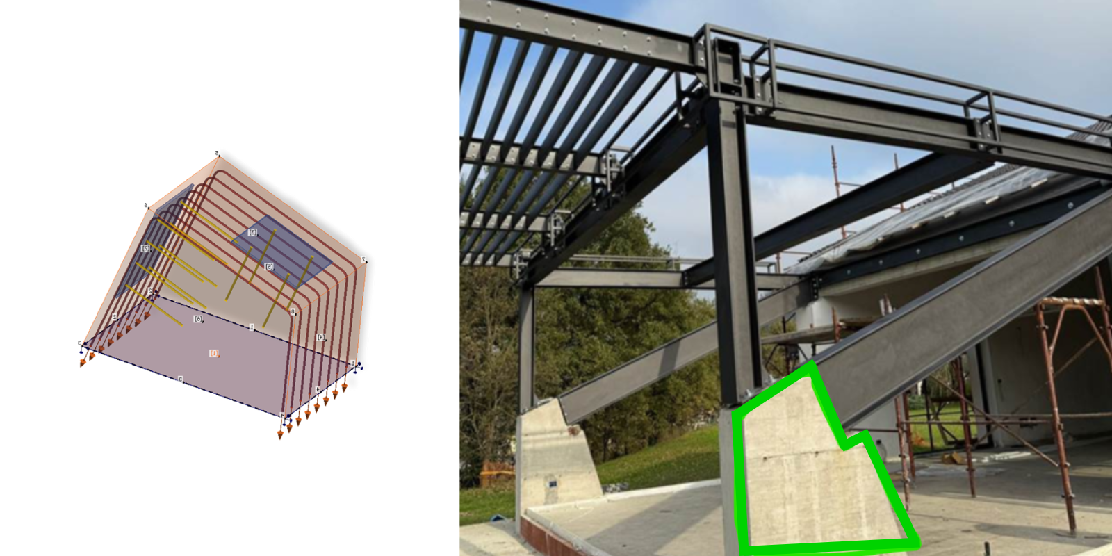- Multiple anchoring in general (bridge support on a common foundation) – A typical situation caused by wind load, where one column of a truss support is loaded by tension and the other by compression. There is a mutual interaction between the concrete cone from the group of tension anchors and the compressive loading from the other column. For such a case, Eurocode does not offer a satisfactory analytical solution, not only because it is inherently necessary to reinforce the concrete foundation, so more advanced analysis such as Detail and its 3D CSFM must be used.