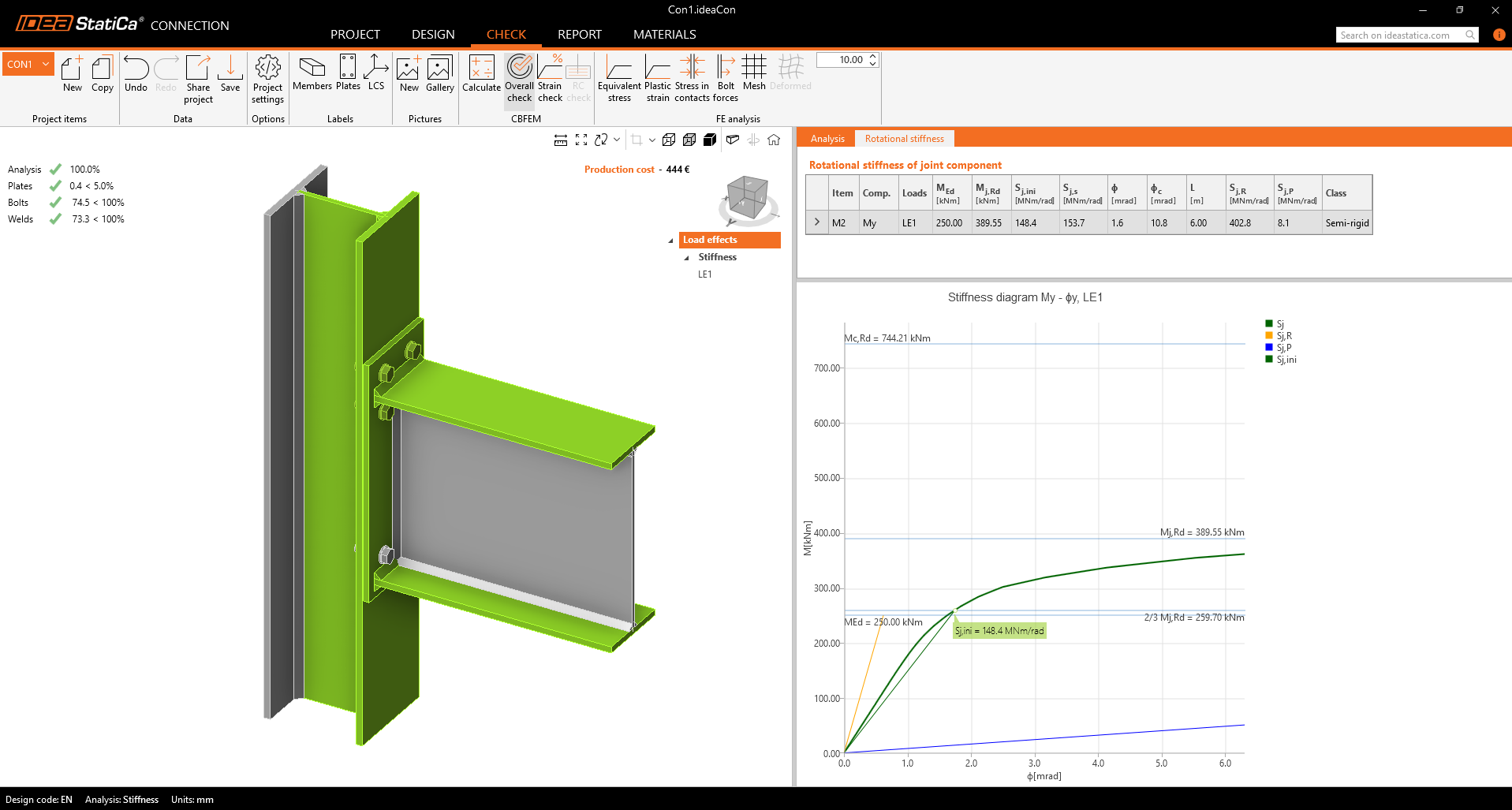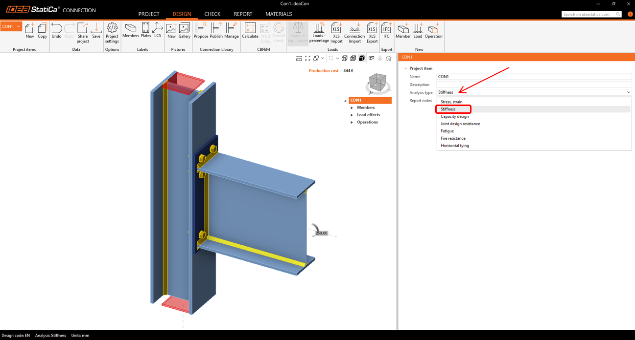Vous pouvez effectuer une analyse de rigidité dans l'application IDEA StatiCa Connection. Pour un flux de travail beaucoup plus rapide, vous pouvez utiliser vos modèles FEA ou CAD globaux pour exporter vos connexions via BIM Link. Ou essayez l'un de nos tutoriels disponibles.