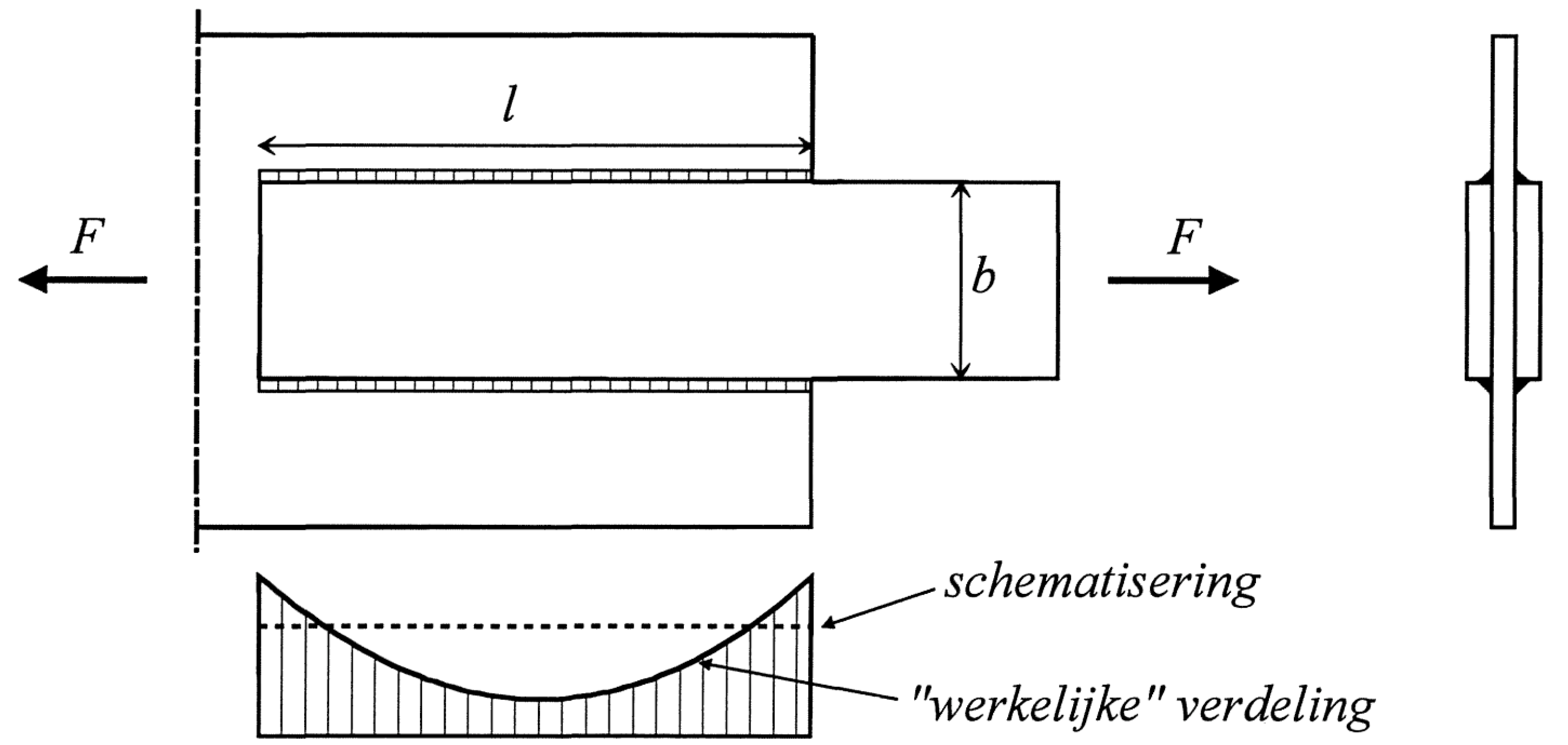 Prenons l’exemple d’un assemblage soudé à bride soumis à une charge longitudinale. Comme pour les assemblages boulonnés, la répartition des contraintes n’est pas uniforme. Néanmoins, on peut indiquer qualitativement quelle serait la répartition des contraintes dans la soudure : les contraintes les plus élevées apparaissent aux extrémités.
