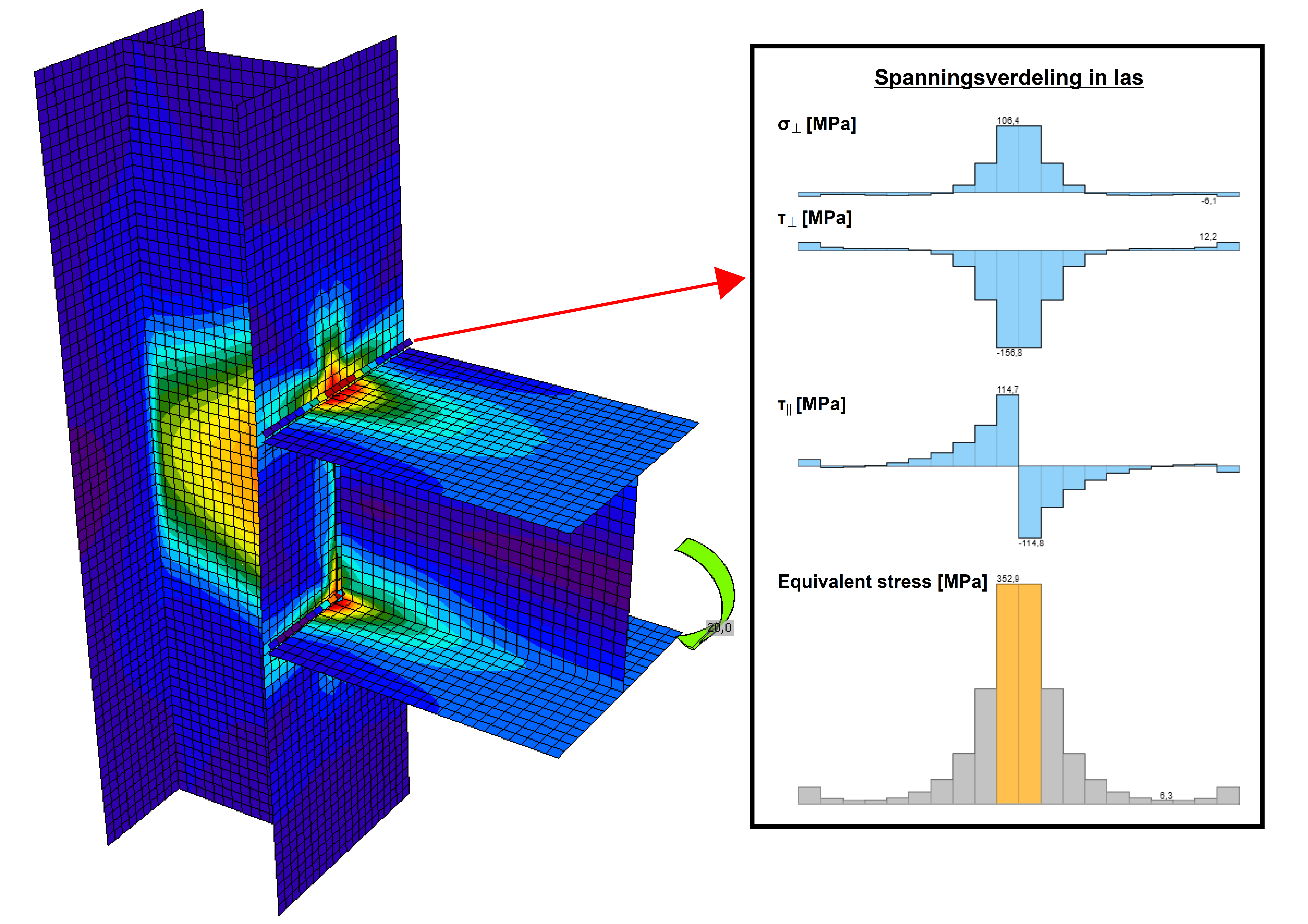D’autres configurations de soudure et combinaisons de charges peuvent conduire à des distributions de contraintes différentes. Une approche semi-empirique est donc choisie comme base pour les règles de calcul de l’Eurocode. Au lieu d’étudier la rupture à l’échelle microscopique, la soudure est testée dans son ensemble à une échelle macroscopique. Un modèle de rupture simplifié basé sur la théorie de la plasticité est adopté. En calculant les résultats d’essais, un critère de rupture (formule de soudure) est ensuite établi.