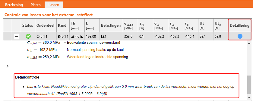 Si l’épaisseur minimale requise n’est pas respectée, IDEA StatiCa affiche un avertissement concernant l’insuffisance de ductilité (Figure 7). En outre, une erreur est générée si une soudure est modélisée avec une section de gorge inférieure à 3,0 mm, ce qui est explicitement interdit par l’EN 1993-1-8, article 4.5.2(2). Le logiciel offre également une fonction « Autodesign » permettant de déterminer automatiquement l’épaisseur de chaque soudure dans le modèle.