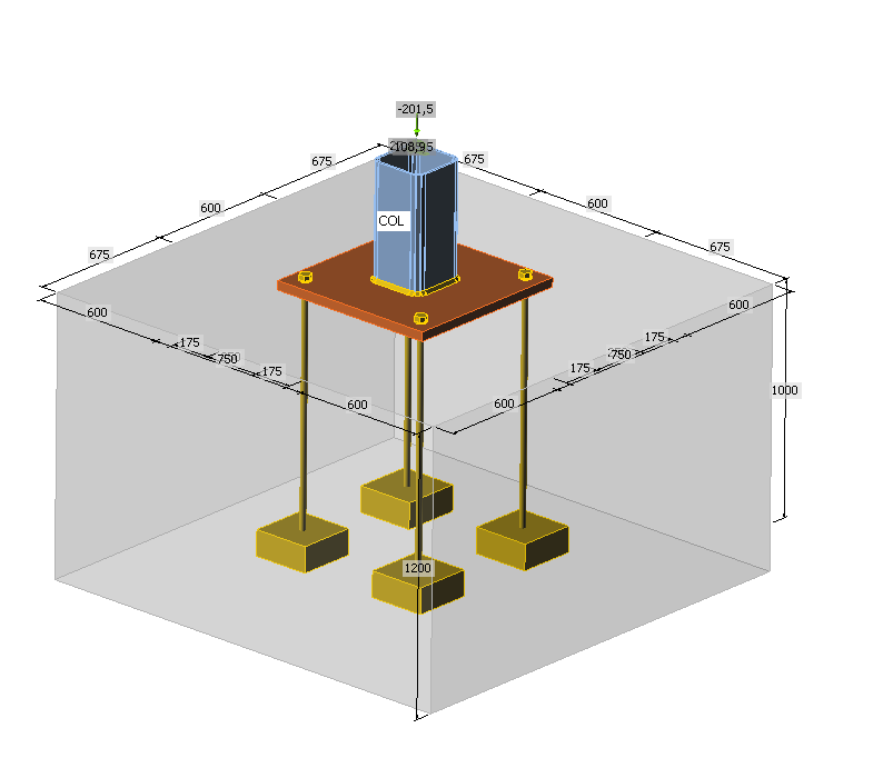 Wind loads moments and shear forces influenced the structure in two directions. The footing was, therefore, a complex connection, given the fact that other programs do not take moments around the X or Y axis into account. Using the BIM link from the CAE software SCIA Engineer, the cross-section parameters, as well as the internal forces on the node, were transferred to IDEA StatiCa Connection. Subsequently, the anchoring including welds could be modeled and checked, as shown below.