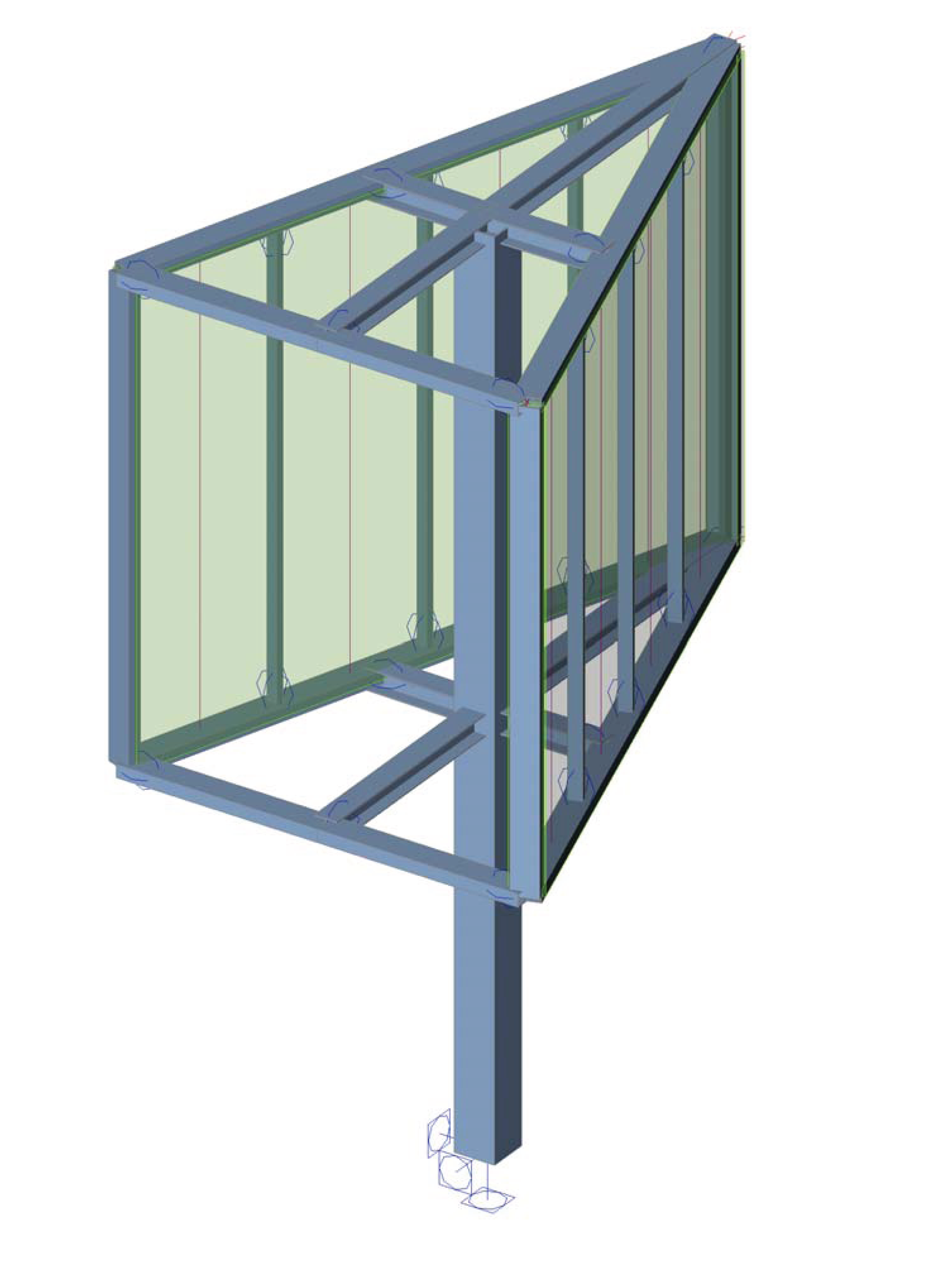 The first presented project is a billboard structure. The task here, in addition to various connections of hollow profiles, was to code-check the anchoring of the foundation.