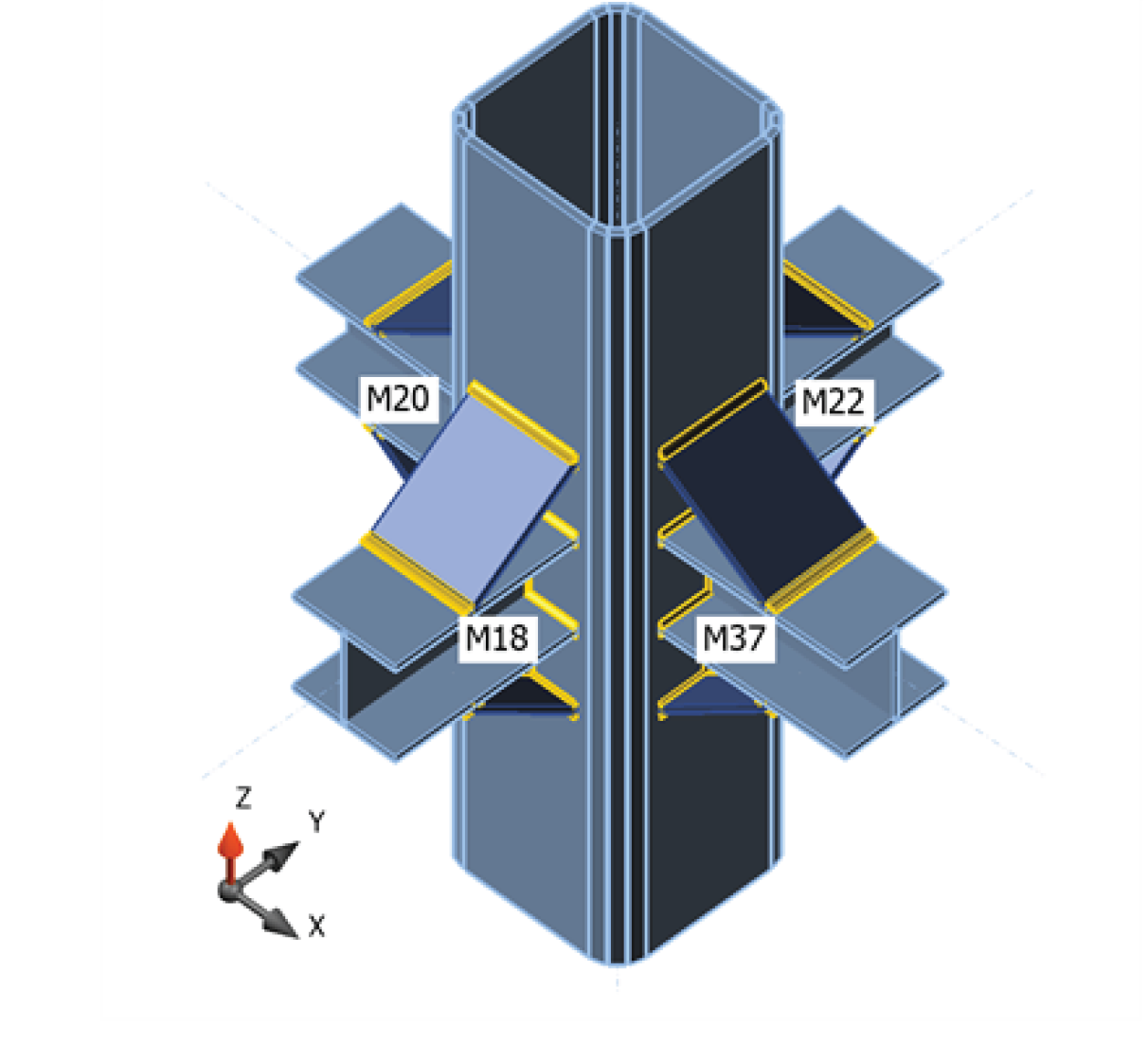 The issue with this joint was the connection of the three profiles, the forces arising in all the members, as well as the additions of stiffeners and ribs. Therefore, the check of the joint is relatively complicated and not entirely replicable without FEM.