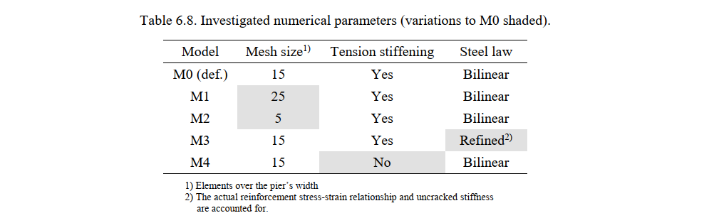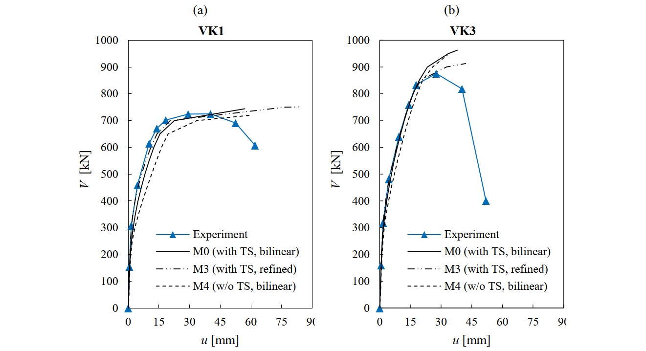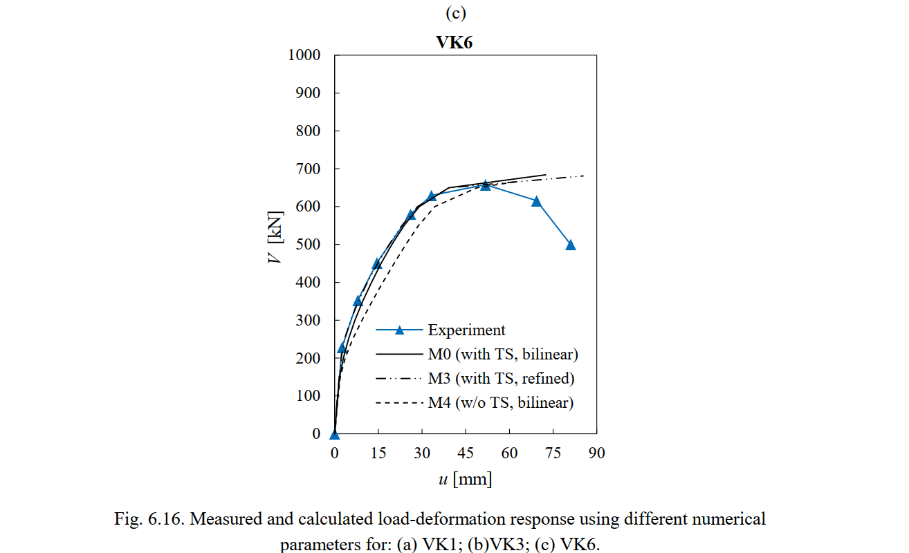 It should be noted that the CSFM does not account for the concrete softening after reaching peak load (instead, a code compliant plastic plateau is implemented). Clearly, the intention of the CSFM is not to capture the softening branch of the experiments. Still, it provides a good estimate of the deflection in the post-peak phase, during which a significant amount of load-bearing capacity is lost (i.e., to give a good estimate of the deformation capacity of the structural members). The results with default parameters (model M0) in Fig. 6.16 show that the numerical analyses detected the failure for a displacement at which the specimens had lost around 15% of their maximum strength. This is a good estimate of the deformation capacity and highlights the capabilities of the CSFM besides the implementation of simple and code-compliant constitutive relationships.