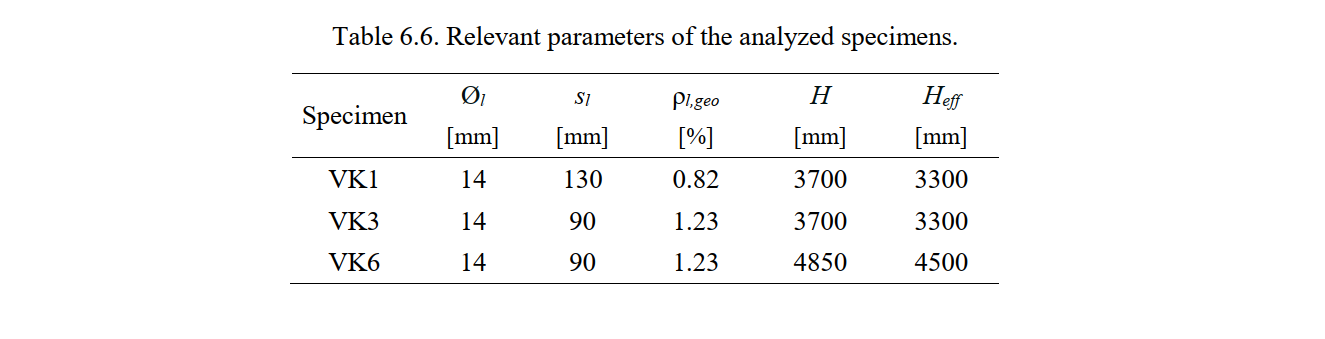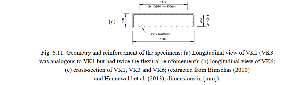 Table 6.7 summarizes the material properties used in the CSFM analysis, which are based on the material tests carried out by Bimschas (2010) and Hannewald et al. (2013). The properties not provided in these reports (the ultimate strain of the flexural reinforcement ɛu and the concrete strength fc for VK6, as well as the concrete strain at peak load ɛc0 for all tests) were assumed to be as indicated in Table 6.7 (expected mean values for materials used).