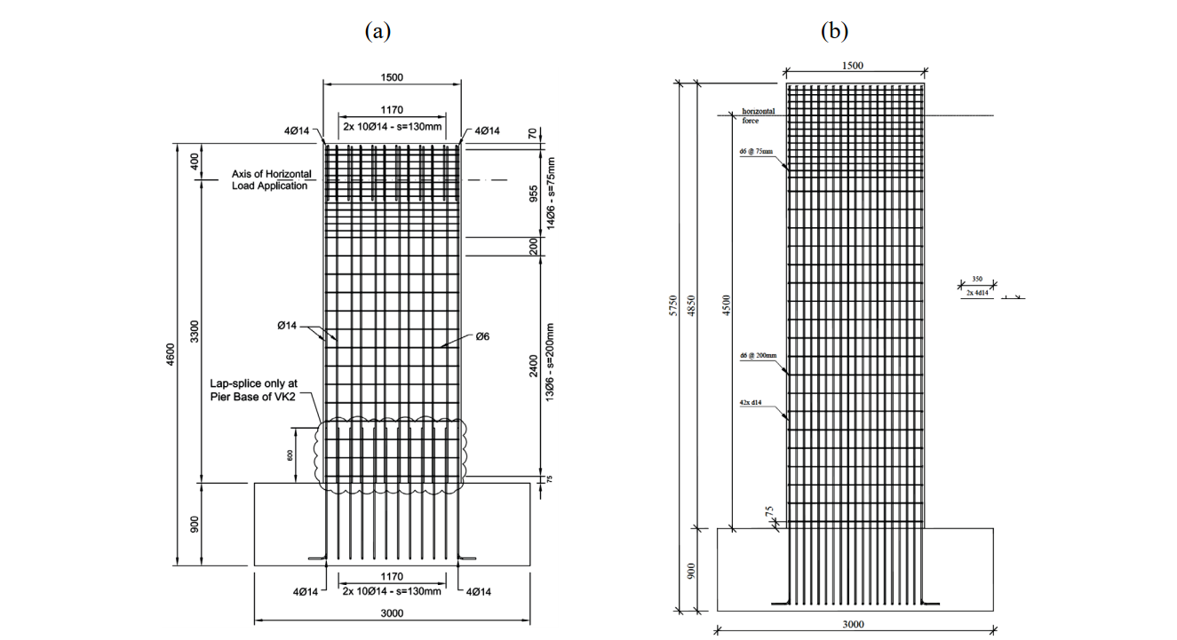 All piers were 1500 mm deep and 350 mm wide. The total height (H) of specimens VK1 and VK3 was 3700 mm, and that of VK6 was 4850 mm, see Fig. 6.11. The specimens stood on a stiff foundation block, which will not be modeled in the CSFM.