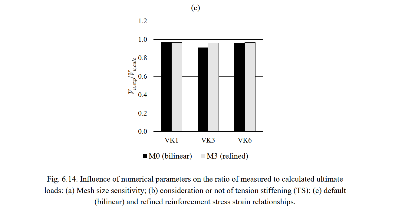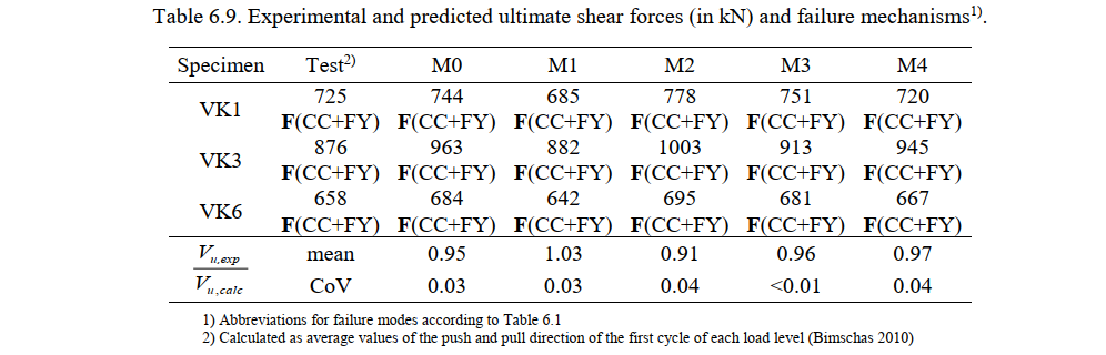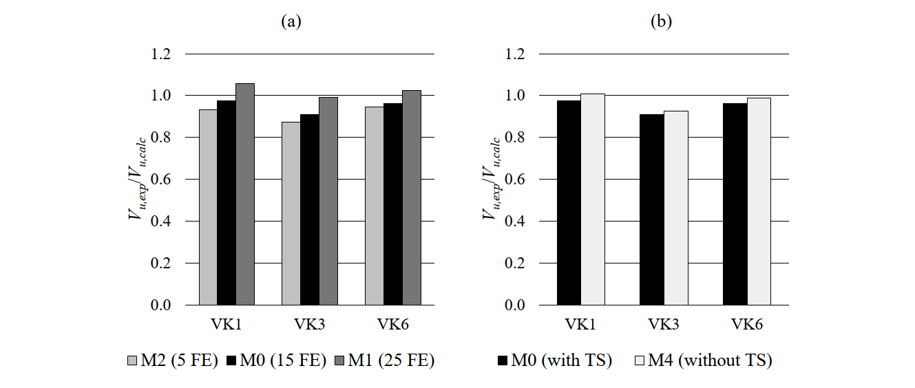 The ultimate shear forces predicted by the CSFM (Vu,calc) and measured in the experiments (Vu,exp), and the respective failure modes, are summarized in Table 6.9. This table also provides the mean and the coefficient of variation (CoV) of the ratios between measured and calculated ultimate loads for each numerical model. Ratios above one denote conservative predictions of the ultimate load. As seen from Table 6.9, the failure mechanisms of all tests were predicted well by the CSFM, independently of the used parameters. The default model M0 leads to slightly unsafe strength predictions (on average 5%): A minor issue, which can be solved by using a finer mesh.