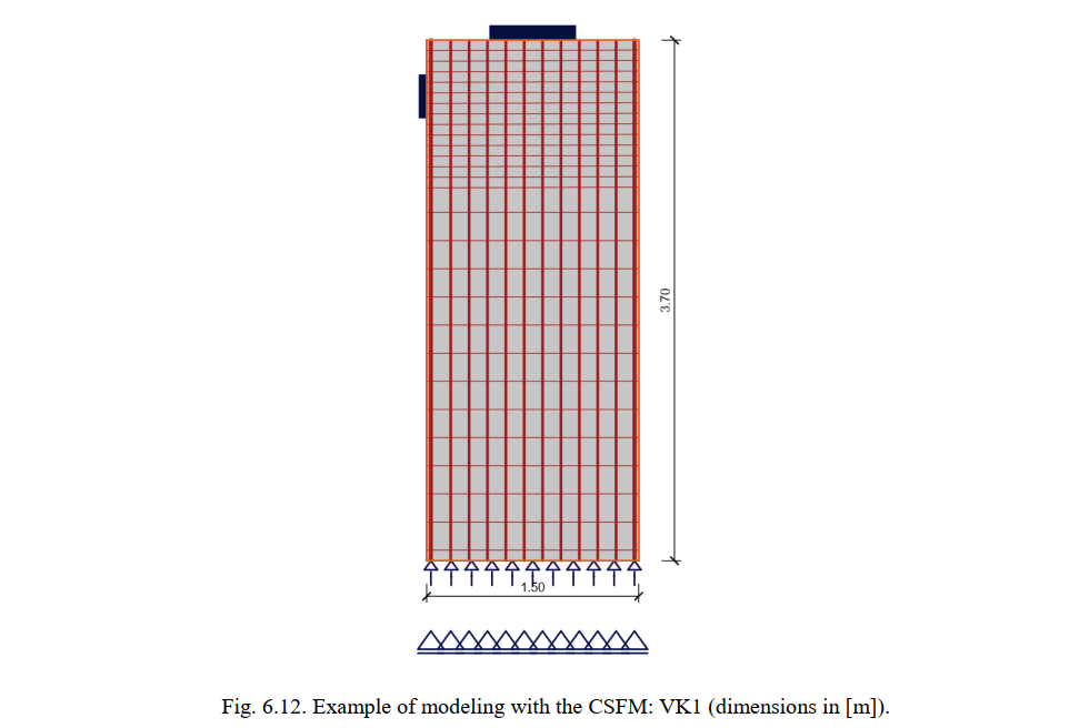 This article is dedicated to the simulation via the CSFM of the load-deformation response of three out of seven cantilever wall-type bridge pier experiments performed by Bimschas (2010) and Hannewald et al. (2013). These experiments were conducted under a vertical constant load, combined with a cyclic (but quasi-static) horizontal force. The design and detailing of the specimens was similar to that of existing bridge piers with seismic deficiencies. Specimens VK1, VK3 and VK6 were selected for analysis with the CSFM. These specimens had different amounts of flexural reinforcement and shear slenderness (achieved by varying the height of the walls). It should be noted that the CSFM just aims at describing the envelope of the cyclic response (so-called “backbone”) using a monotonic model.