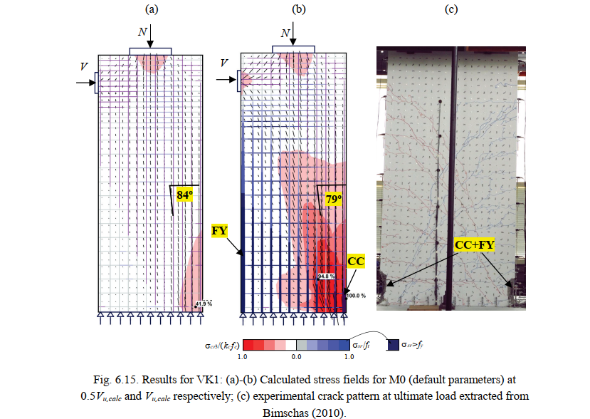 Fig. 6.15a-b shows the continuous stress field results in Specimen VK1 provided by the CSFM for two load steps (0.5Vu,calc and Vu,calc). These results were calculated using default numerical parameters (M0). It can be seen that due to plastic redistributions, the compression field was significantly steeper (more inclined with respect to the vertical wall axis) at ultimate. The predicted failure mode (concrete crushing with yielding of the flexural reinforcement) is highlighted in Fig. 6.15b. The location agrees with the experimental observations (highlighted in Fig. 6.15c, where it can be seen that the cyclic loading produced concrete crushing in both sides).