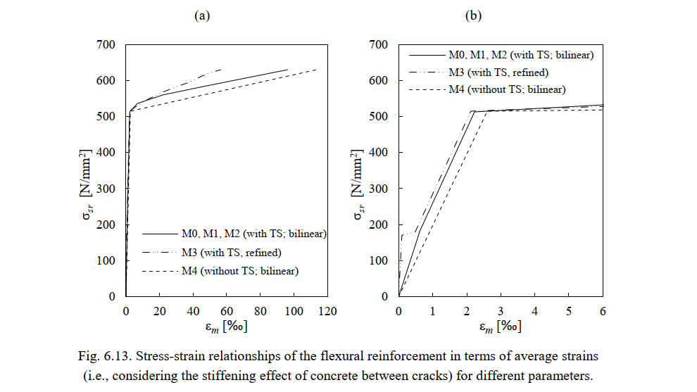 An example of the influence of the used parameters on the response of the reinforcement (including the tension stiffening effect) is illustrated in Fig. 6.13 for the flexural reinforcement. The consideration of the uncracked stiffness is reflected in the elastic part of these diagrams.