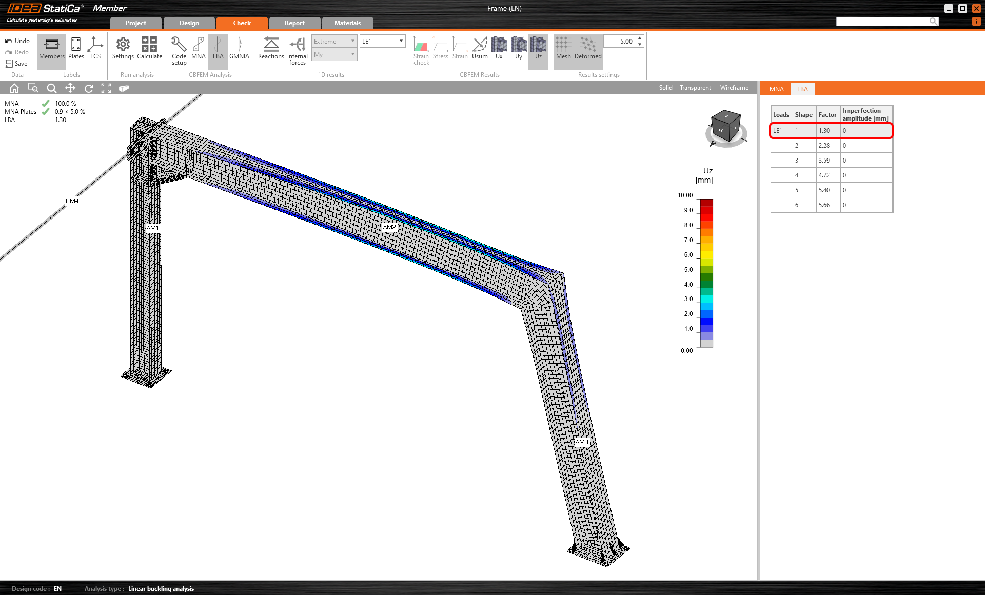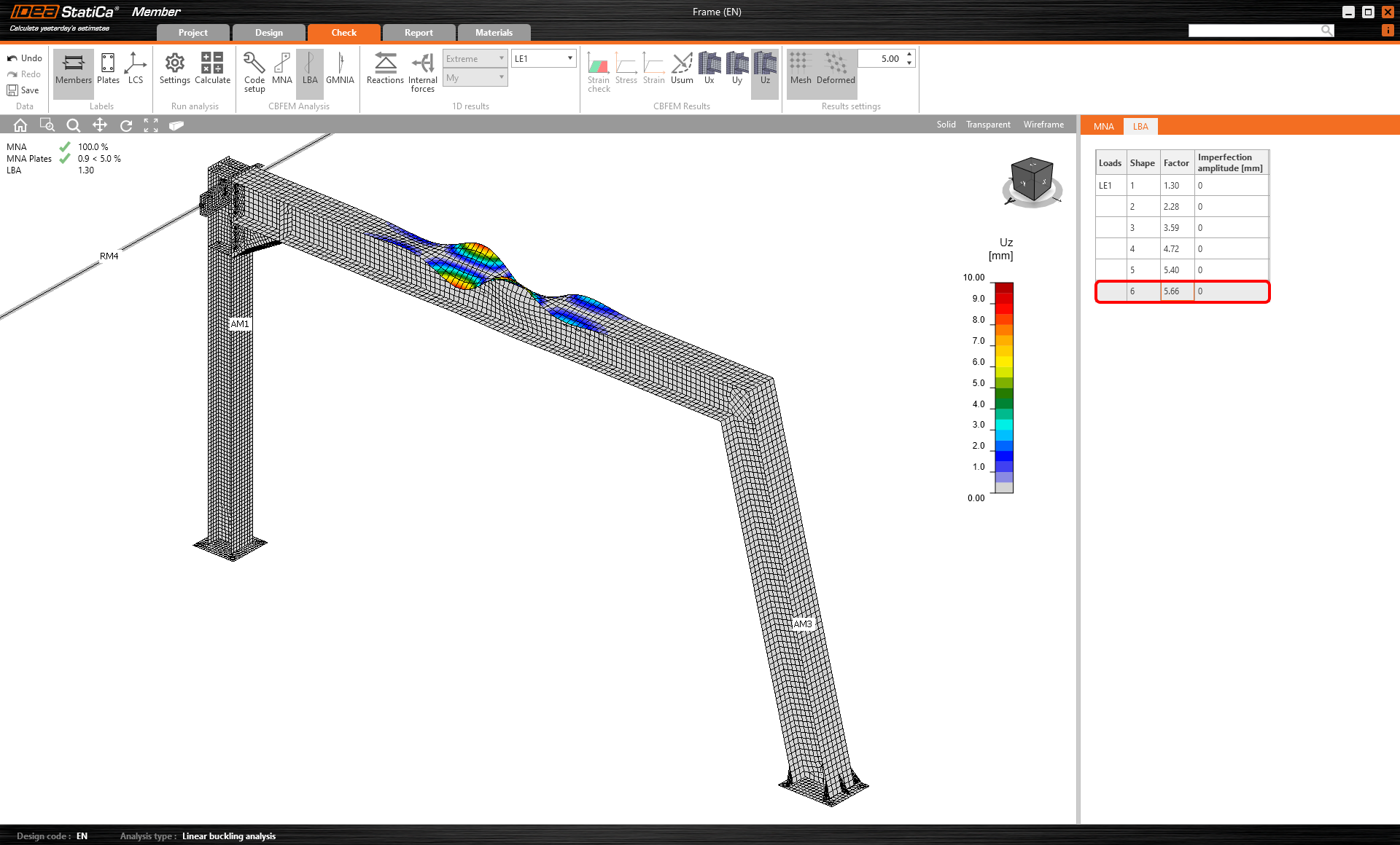 Vous pouvez lire les facteurs de la forme de voilement dans l'onglet et voir la visualisation de la première forme 1 de voilement si vous activez l'affichage Uy pour un meilleur aperçu de déformation.