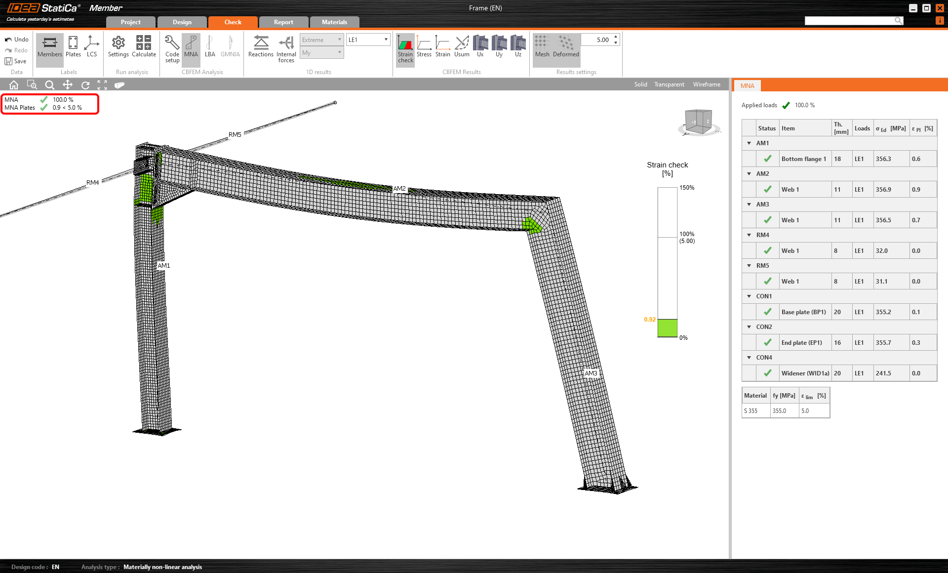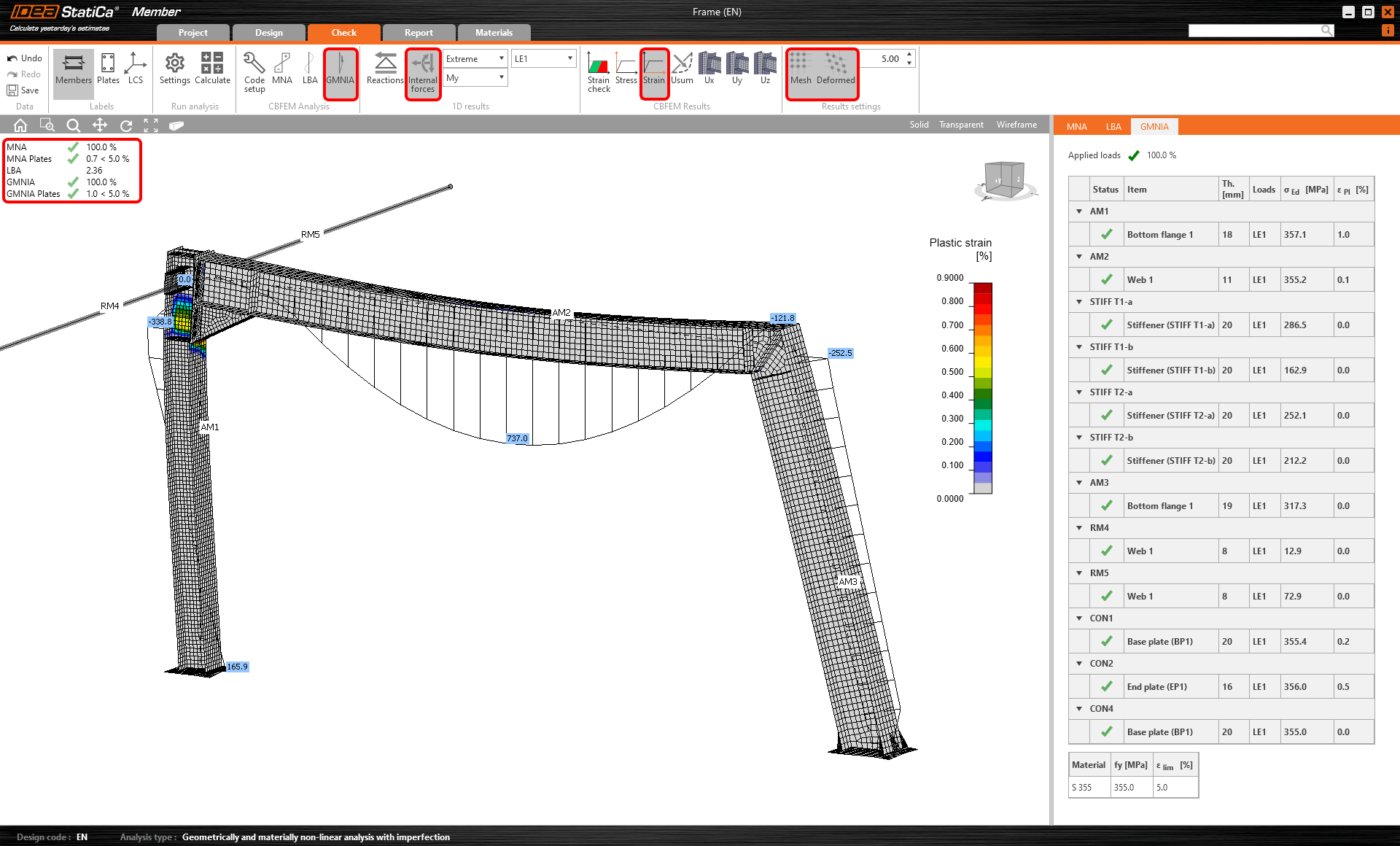 Maintenant revenez à l'onglet Vérification et répétez le calcul en trois étapes – MNA, LBA, GMNIA. La charpente conçue a maintenant réussi les vérifications de stabilité avec des imperfections initiales appliquées et vous pouvez parcourir les résultats tels que distribution de déformation et diagramme des efforts internes.