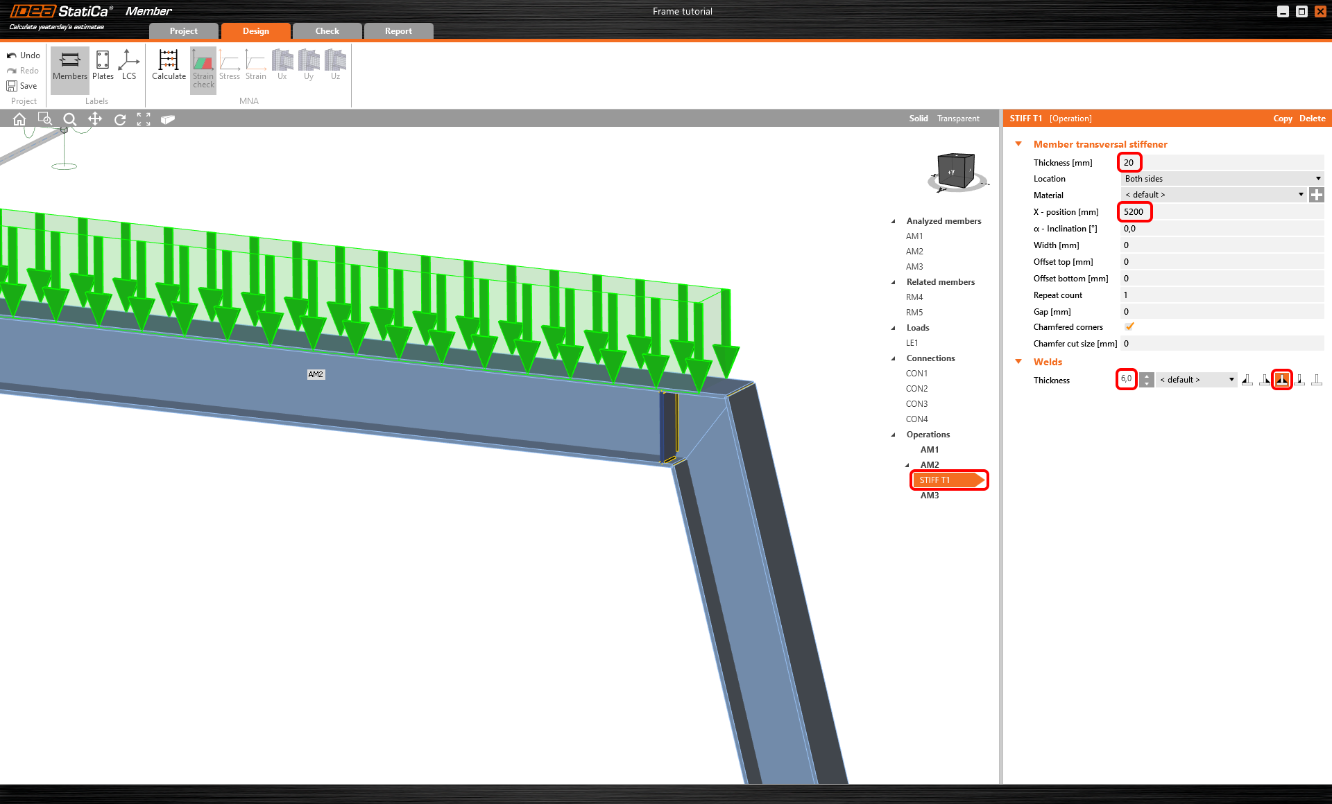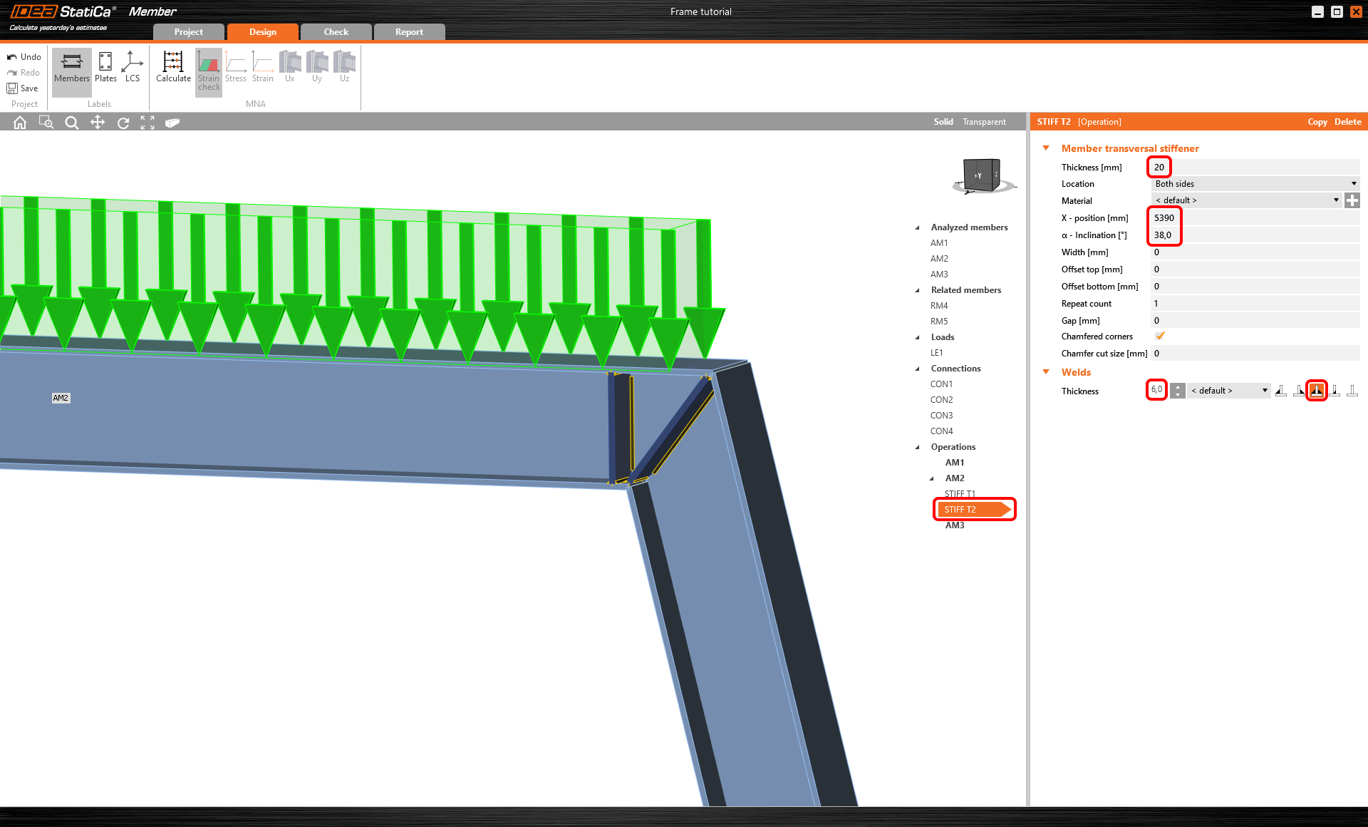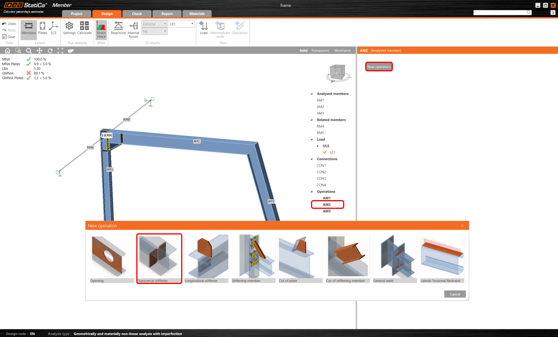 Revenez à l'onglet Conception et passez à Opérations dans la liste, cliquez avec le bouton droit sur AM2 et ajoutez des raidisseurs transversaux pour renforcer le coin le plus contraint de la charpente et réduire les effets de voilement.